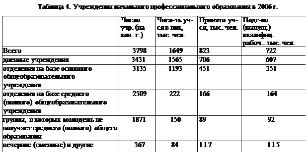Кроме того, могут выделяться как дневные, так и вечерние образовательные учреждения. В целом данные о начальных профессиональных учреждениях можно представить в таблице (Таблица 4). Учредителями государственного образовательного учреждения начального профессионального образования могут быть только органы государственной власти и управления РФ либо субъекта РФ, а муниципального - органы местного самоуправления. Статус учредителя (учредителей) определяет организационно-правовую форму образовательного учреждения. Учреждение начального профессионального образования получает право на образовательную деятельность и льготы, предоставляемые законодательством Российской Федерации, с момента выдачи ему государственным органом управления образованием или по его поручению местным органом управления образованием лицензии (разрешения), в которой фиксируются контрольные нормативы, предельная численность контингента обучающихся, срок, на который выдана лицензия. Лицензия может быть изъята у образовательного учреждения начального профессионального образования государственным органом, выдавшим ее, в случае нарушения требований и нормативов, содержащихся в лицензии. Аттестация образовательного учреждения начального профессионального образования проводится по его заявлению государственной аттестационной службой в установленном порядке один раз в пять лет. Образовательное учреждение начального профессионального образования может быть лишено государственной аккредитации по результатам аттестации. Образовательное учреждение начального профессионального образования может получать общественную аккредитацию в различных российских, зарубежных и международных общественных (образовательных), научных и промышленных структурах, что не влечет за собой дополнительных финансовых обязательств со стороны государства. Образовательный процесс в образовательных учреждениях начального профессионального образования строится с учётом возрастных и индивидуальных особенностей обучающихся. Содержание образования в образовательном учреждении начального профессионального образования должно обеспечивать получение обучающимся профессии и соответствующей квалификации, а также содействовать взаимопониманию и сотрудничеству между людьми, народами, различными расовыми, национальными, этническими, религиозными и социальными группами; способствовать реализации права обучающихся на свободный выбор взглядов и убеждений. Образовательный процесс включает теоретическое и производственное обучение, производственную практику, а также воспитательную работу с обучающимися. Учебная нагрузка обучающихся не должна превышать 36 часов в неделю и должна соответствовать Санитарно-эпидемиологическим правилам и нормативам. Образовательное учреждение начального профессионального образования самостоятельно в выборе оценок, формы, порядка, периодичности текущего контроля успеваемости и промежуточной аттестации, обеспечивающих получение обучающимися профессионального образования по профессии (специальности) соответствующего уровня и квалификации. Обучающиеся образовательного учреждения начального профессионального образования объединяются по профессиям (специальностям) в учебные группы. При расчёте нормативов бюд