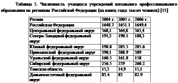 Рисунок 2. Число государственных и муниципальных дневных общеобразовательных учреждений Томской области и количество в них обучающихся [14]. Следовательно, необходима реструктуризация сети образовательных учреждений, которая проводится в течение последнего десятилетия. Она осуществляется на плановой основе, в ходе реализации муниципальных и областных целевых программ, а также инновационных проектов, связанных с созданием муниципальных образовательных округов и культурно-образовательных комплексов. В условиях ограниченности бюджетов всех уровней именно реструктуризация обеспечивает рационализацию бюджетных затрат и дополнительные ресурсы на повышение качества образовательных услуг. Это позволит обеспечить необходимый запас прочности для реализации общедоступного и бесплатного начального, основного и среднего (полного) общего образования в долгосрочной перспективе. 1.3.3 Профессиональное образование Начальное профессиональное образование Начальное профессиональное образование имеет целью подготовку работников квалифицированного труда (рабочих, служащих) по всем основным направлениям общественно полезной деятельности на базе основного общего образования. По отдельным профессиям начальное профессиональное образование может базироваться на среднем (полном) общем образовании. Начальное профессиональное образование может быть получено в образовательных учреждениях начального профессионального образования (профессионально-технических и иных училищах данного уровня). Основными задачами учреждения начального профессионального образования являются: - создание необходимых условий для удовлетворения потребности личности в получении начального профессионального образования, конкретной профессии (специальности) соответствующего уровня квалификации с возможностью повышения общеобразовательного уровня обучающихся, не имеющих среднего (полного) общего образования, - ускоренное приобретение трудовых навыков для выполнения определённой работы или группы работ. В Типовом положении об учреждении начального профессионального образования (утв. постановлением Правительства РФ от 5 июня 1994 г. N 650) предусмотрены следующие основные виды государственных и муниципальных образовательных учреждений начального профессионального образования: Профессиональное училище (строительное, швейное, электротехническое, сельское и т.п.). Данное образовательное учреждение осуществляет реализацию образовательных программ начального профессионального образования, обеспечивающих приобретение обучающимися конкретной профессии соответствующего уровня квалификации с получением или без получения среднего (полного) общего образования. Профессиональное училище является основным типом учреждения начального профессионального образования, в котором осуществляется наиболее массовая подготовка квалифицированных кадров рабочих и служащих. На базе профессионального училища может осуществляться разработка и внедрение передовых методик в области начального профессионального образования по соответствующему профилю подготовки квалифицированных кадров, обеспечивающих высокий уровень профессионального образования и профессиональной подготовки, удовлетворяющих запросы личности и производства. Профессиональны