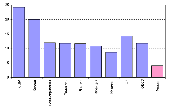 В 2005 году доля расходов на высшее образование в федеральном бюджете составляла 70%, в 2006 году она выросла почти до 77% и сохранилась на этом уровне в федеральном бюджете 2007 года. При общем росте финансирования образования из федерального бюджета в 1,3 раза расходы на высшую школу выросли в 1,43 раза. В федеральном бюджете на 2007 год рост расходов на образование составил 38,3% по сравнению с аналогичными расходами федерального бюджета 2006 года. Это - наибольший рост, начиная с 2003 года. В результате удельный вес расходов на образование в расходах федерального бюджета вырос до 5,1 % (в 2006 году - 4,7%). В структуре расходов федерального бюджета на образование в 2008-2010 годах наибольшая доля приходится на расходы на высшее профессиональное образование (77,4; 77,6; 74,9% соответственно). Расходы на ВПО в первые два года должны расти практически теми же темпами, что и расходы на образование в целом, однако в 2010 году темп роста расходов на высшее образование запланирован ниже темпа роста общих расходов на образование в федеральном бюджете. В странах ОЭСР доля расходов на образование в ВВП - на уровне государственных и частных - в последние годы стабилизировалась, в среднем, на уровне 5,5%. При этом данный показатель колеблется по странам от 3,5% ВВП (Турция) до 8,7% ВВП (Израиль). Таким образом, Россия несколько отстает от стран ОЭСР по средним значениям доли расходов на образование в ВВП, но находится в «интервале допустимых значений». Однако следует отметить, что в странах ОЭСР учитываются только легальные расходы на образование. Кроме того, Россия сильно отстает от стран ОЭСР по доле расходов в ВВП на общее образование, где речь идет преимущественно о государственных (бюджетных) расходах. Средний по ОЭСР показатель в данном случае приближается к 3,8% ВВП, в то время как в России он, поднявшись с 2,4% в 2000 году до 3,0% в 2002-м, в 2007 году вновь снизился до 2,9%. В 2001 году расходы на 1 бюджетного студента в Российской Федерации были в 6,5 раза ниже средних бюджетных расходов на 1 студента в странах ОЭСР. В 2007 году этот разрыв за счет ускоренного наращивания расходов на высшее образование в 2006 и 2007 году сократился до 3 раз, что существенно (рис. 7).
