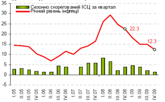 Додатковим чинником, який не давав знижуватись інфляції у повній мірі були високі інфляційні очікування, що генерувались високим ступенем невизначеностей в політиці та економіці, в першу чергу пов’язані із значним дефіцитом бюджету та відсутністю джерел його покриття, а також низькими темпами відновлення довіри до банківської системи. З іншого боку, динаміка монетарних агрегатів протягом року (грошова маса за рік знизилась на 5.5%) та видатки державного бюджету у ІІ півріччі мали стримуючий вплив на інфляцію як в ІV кварталі, так, відповідно, і в грудні. ІСЦ за місяць зріс на 0.9% ( Таблиця 2.2.1) в основному за рахунок зростання цін на продукти харчування. При цьому, нехарактерно для грудня знизились ціни на фрукти (-2.9%). У 2009 році спостерігалася стійка тенденція до уповільнення темпів росту ІСЦ як в річному (з 22.3% до 12.3%), так і квартальному обчисленні ( Мал.2.2.1). При цьому інфляція за результатами року виявилася значно нижче за очікування економічних агентів та аналітиків різних експертних інститутів. Основними причинами виступали як завищення ефектів переносу девальвації та інфляційних очікувань на ІСЦ, так і припущення щодо значного підвищення тарифів, які регулюються адміністративно.Припинення відтоку депозитів з банківської системи дозволило більш ефективно управляти ліквідністю, що сприяло стабілізації ситуації на валютному ринку. Укріплення обмінного курсу гривні у ІV кварталі 2009 року стало головним фактором зниження річних темпів росту вузької базової інфляції до 12.8% (0.3% - у грудні). Так як вузька базова інфляція відображає світовий інфляційний розвиток та нашу конкурентоспроможність, то можна очікувати зниження інфляційного тиску.