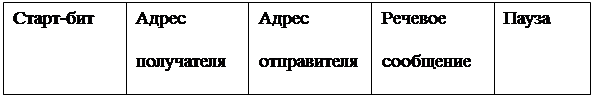 Рис. 3.3 Формат передаваемого сообщения Передаваемое сообщение состоит из 5-и полей: - старт-бит; - адрес получателя; - адрес отправителя; - речевое сообщение; - пауза. Старт-бит переводит микроконтроллер в режим «прием». Адрес получателя несет в себе информацию о том кому адресовано сообщение. Адрес отправителя необходим для определения исходящего абонентского устройства, после приема и декодирования которого подсвечивается соответствующий индикатор и вызываемому абоненту становится известно о том кто его беспокоит. Далее следует само речевое сообщение. Пауза - это состояние моноканала при котором в нем поддерживается состояние логической единицы в течение 2 - 3 периодов ШИМ сигнала. При приеме речевого сигнала микроконтроллер постоянно следит за состоянием моноканала и при обнаружении паузы переводит абонентское устройство в режим ожидания. Рассмотрим временную диаграмму, поясняющую алгоритм формирования адресной части передаваемого сообщения (см. рис. 3.4).