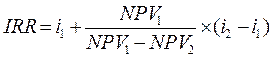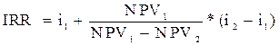 n – количество периодов. Характеризуя показатель «период окупаемости», следует обратить внимание на то, что он может быть использован для оценки не только эффективности инвестиций, но и уровня инвестиционных рисков, связанных с ликвидностью (чем продолжительнее период реализации проекта до полной его окупаемости, тем выше уровень инвестиционных рисков). Недостатком этого показателя является то, что он не учитывает те денежные потоки, которые формируются после периода окупаемости инвестиций. Так, по инвестиционным проектам с длительным сроком эксплуатации после периода их окупаемости может быть получена гораздо большая сумма чистого приведенного дохода, чем по инвестиционным проектам с коротким сроком эксплуатации (при аналогичном и даже более быстром периоде окупаемости). Внутренняя норма доходности (IRR) является наиболее сложным из всех показателей с позиции механизма его расчета. Этот показатель характеризует уровень доходности конкретного инвестиционного проекта, выражаемый дисконтной ставкой, по которой будущая стоимость денежного потока от инвестиций приводится к настоящей стоимости инвестируемых средств. Внутреннюю норму доходности можно охарактеризовать как дисконтную ставку, при которой чистый приведенный доход в процессе дисконтирования будет приведен к нулю. Для определения внутренней нормы доходности используются методы приближенных расчетов, одним из которых является метод линейной интерполяции. Для применения данного метода необходимо выполнить следующий алгоритм: 1. Произвольно подбирается ставка процента и определяется величина приведенного денежного потока для каждого варианта ставок. 2. Определяется значение чистого приведенного дохода для каждого варианта ставки. 3. Подбор ставки продолжаем до первого отрицательного значения чистого приведенного дохода. 4. Берутся два значения: предпоследняя ( На данном рисунке Методом интерполяции находим расчетное значение внутренней нормы доходности по формуле: