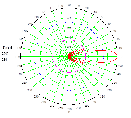 рис.9 Уровень боковых лепестков для решетки с оптимальным расстоянием между излучателями характеризуется следующим соотношением: