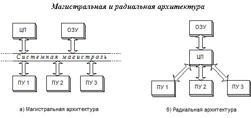 Рис. 2‑1 · Магистральная архитектура основана на подключении всех имеющихся устройств, включая процессор и память, к единой системной магистрали (шине), которая объединяет в себе линии передачи данных, адресов и управляющих сигналов. Совместное использование магистрали различными устройствами подчиняется специальным правилам (протоколу), обеспечивающему корректность работы магистрали. · Радиальная архитектура предполагает, что каждое из устройств, включая память, подключается к процессору отдельно, независимо от других устройств, и взаимодействует с процессором по собственным правилам. Для программиста понятия магистральной и радиальной архитектуры имеют несколько иное содержание, чем для инженера-системотехника. С точки зрения программной архитектуры, неважно, подсоединено ли устройство к процессору напрямую или через посредство системной магистрали. Важно то, какие сигналы должна посылать и принимать программа, работающая с устройством, и какие команды могут для этого использоваться. Основная особенность магистральной архитектуры – единообразный способ подключения всех устройств. Структура регистров устройства стандартизуется, при этом определяется, какими сигналами любое устройство может обмениваться с процессором и каким разрядам регистра должны соответствовать эти сигналы. Конечно, не всякое устройство нуждается в использовании всего набора стандартных сигналов. Некоторые типы устройств могут, например, не генерировать прерываний, не сообщать об ошибках. Но те сигналы, которые устройство использует, должны соответствовать стандарту данной магистрали. Преимуществом магистральной архитектуры является простота подключения новых типов устройств, поэтому такая архитектура особенно удобна для открытых вычислительных систем, т.е. таких, которые рассчитаны на расширяемый набор периферийных устройств. Напротив, для радиальной архитектуры характерен индивидуальный выбор способа подключения, наиболее удобного для каждого типа устройств. При этом в принципе можно достичь экономии аппаратных ресурсов и более высокой эффективности. Случается даже, что в одном порту объединяются управляющие сигналы от нескольких разных устройств. Очевидно, подобная архитектура удобна только в том случае, когда она рассчитана на постоянный набор устройств. Расширение радиальной системы всегда вызывает затруднения. Исходя их этих определений, не так уж легко точно охарактеризовать современные IBM-совместимые ПК. Исходная модель IBMPC имела довольно четко выраженную радиальную архитектуру и небольшой набор стандартных устройств. В последующих моделях были сделаны значительные шаги по стандартизации подключения новых устройств. Однако и сегодня эти компьютеры не тянут на магистральную архитектуру в полном смысле слова: у них для этого слишком много разных шин. Важной деталью архитектуры современных компьютеров является такое устройство, как контроллер прямого доступа к памяти (ПДП, англ. DMA – Direct Memory Access). Если обычно весь обмен данными идет через регистры процессора, то ПДП подразумевает прямой перенос данных с устройства в память или обратно. Роль процессора в данном случае только в том, чтобы инициировать операцию ввода/вывода блока данных, послав соответствующие команды контроллеру ПДП. Далее процессор не учас