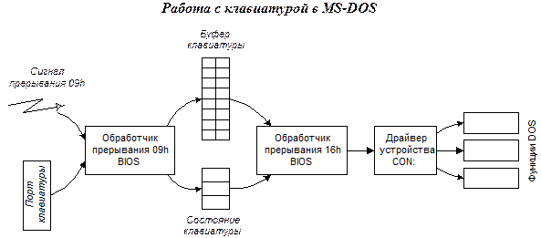 Рис. 2‑6 Когда пользователь нажимает клавишу, клавиатура переходит в состояние готовности и по этому поводу посылает сигнал аппаратного прерывания Int 09h. Одновременно в порт, к которому подключена клавиатура, посылается скан-код нажатия клавиши. Этот код представляет собой однобайтовое число, означающее порядковый номер нажатой клавиши. Если клавиша долго удерживается нажатой, то через некоторое время начинается «автоповтор» – сигнал прерывания и скан-код посылаются многократно. Наконец, когда клавиша отпускается, генерируется еще одно прерывание и посылается скан-код отпускания клавиши, который отличается от кода нажатия единичным значением старшего бита. Этим практически исчерпываются аппаратные события, связанные с клавиатурой. Все остальное делается программно. На самом деле, все происходило именно так со старой, 83-клавишной клавиатурой компьютеров IBMPCXT. Современные клавиатуры за одно нажатие умудряются послать от 1 до 4 скан-кодов подряд. Причины этого объяснять долго и не очень интересно. Подпрограмма BIOS, обрабатывающая аппаратное прерывание от клавиатуры, должна, во-первых, запоминать текущее состояние клавиатуры: нажаты или нет «сдвиговые» клавиши Shift, Ctrl, Alt, включены или нет режимы Caps Lock, Num Lock. Во-вторых, обработчик должен с учетом этого состояния определить, какой символ хотел ввести пользователь. Одна и та же клавиша может, например, означать букву ‘Z’ прописную или строчную, русскую букву ‘Я’ прописную или строчную, а также быть частью комбинаций Ctrl+Z, Alt+Z. Соответствующий символ будет помещаться в буфер клавиатуры в виде двух байт: скан-код нажатой клавиши и ASCII-код символа. Для некоторых клавиш и комбинаций, которым не соответствует никакой ASCII-код (например, F1, Insert, Ctrl+Home, Alt+буква, -), фирма IBM разработала собственный набор «расширенных» кодов. Буфер клавиатуры может вместить до 15 введенных символов, а при переполнении начинает противно пищать. Программное прерывание Int 16h также обрабатывается BIOS’ом. Его назначение – удовлетворять запросы программ, обращающихся к клавиатуре. Наиболее часто используются следующие три функции этого прерывания. · Ввод символа с ожиданием. Эта функция возвращает значение кодов очередного символа из буфера клавиатуры и удаляет этот символ из буфера. Если буфер был пуст, функция выполняет активное ожидание до тех пор, пока при обработке очередного нажатия клавиши в буфере не появится введенный символ. · Ввод символа без ожидания. Он отличается тем, что при пустом буфере не происходит ожидания, а возвращается соответствующий признак. Без этой функции было бы невозможно запрограммировать большую часть игр. · Опрос состояния клавиатуры. Возвращает информацию о текущем состоянии «сдвиговых» клавиш. Прикладные программы могут вызывать либо прерывание Int 16h, либо одну из функций DOS, предназначенных для ввода символов с консоли. Следует подчеркнуть, что эти функции работают не с клавиатурой, а с устройством CON (консолью оператора), через драйвер этого устройства. Конечно, практически всегда устройство CON – это и есть клавиатура (плюс еще и экран монитора, который используется при выводе символов на консоль). Однако теоретически есть возможность написать нестандартный драйвер устройства CON, который будет брать вводимые символы, например, с удаленного терминала, через модем. Или в кач