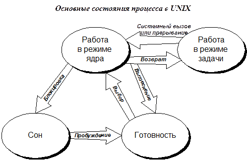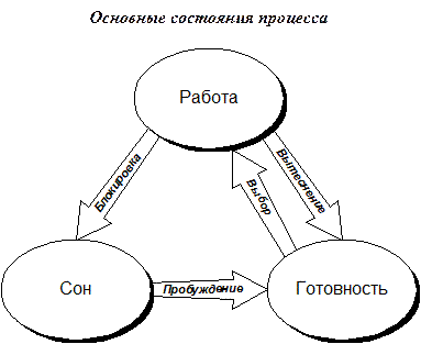 Рис. 4‑1 Рассмотрим возможные переходы между состояниями процесса, показанные на рисунке стрелками. Переход Работа - Сон представляет собой блокировку процесса, которая может произойти при вызове блокирующей системной функции. Переход Сон - Готовность – это пробуждение процесса, оно выполняется системой при возникновении соответствующего условия. Переход Работа - Готовность ранее не рассматривался. Он называется вытеснением процесса и выполняется системой, когда она принимает решение о смене текущего процесса. Для обратного перехода Готовность - Работа нет общепринятого термина. Будем называть его выбором процесса для выполнения. Отметим, что этот переход почти всегда связан либо с блокировкой, либо с вытеснением прежнего текущего процесса. Ответьте сами на вопрос: почему «почти всегда», а не «всегда»? Какие еще возможны варианты? Двух стрелок нет на диаграмме. Прямой переход от сна к работе нелогичен, т.к. он совмещал бы два совершенно разных действия. Каких именно? Переход от готовности ко сну невозможен в принципе. Кстати, почему? Помимо трех основных состояний, в различных ОС могут использоваться и другие состояния. Состояние старта означает, что процесс находится на этапе создания и пока не готов вступить в работу. Состояние завершения (в UNIX оно почти официально называется «зомби») означает, что процесс завершил свою работу, но пока присутствует в системе в виде записи о результатах и причине завершения. Состояние приостановки (suspended) означает, что выполнение процесса временно прервано оператором (или, может быть, другим процессом) и позднее должно быть им же возобновлено. В некоторых системах (например, в UNIX) основные состояния раздроблены на ряд более мелких: работа в системном и в пользовательском режиме, готовность в памяти и готовность на диске и т.п. Необходимый набор состояний определяется алгоритмами работы конкретной ОС. 4.2.4. Вытесняющая и невытесняющая многозадачность Все многозадачные ОС можно разделить на два класса, различающиеся по способам организации переключения процессов. В системах с невытесняющей диспетчеризацией (non-preemptivemultitasking) работа любого процесса может быть прервана только «по инициативе самого процесса», а точнее – только когда процесс вызывает определенные системные функции. К ним относятся, в частности, описанные выше блокирующие функции. Может также иметься функция, специально предназначенная для добровольной уступки процессом очереди на выполнение (Yield). Вызов такой функции не приводит к блокировке, но может привести к вытеснению процесса[7] . Если работающий процесс не вызывает системных функций, а занимается, например, долгими расчетами, то все остальные процессы вынуждены простаивать. Когда же системная функция, наконец, вызвана, то система, прежде всего, проверяет, может ли эта функция быть выполнена сразу или предполагает ожидание некоторого события (требуемый ресурс может быть занят другим процессом; операция ввода/вывода обычно требует определенного времени на свое выполнение; очередь сообщений, требующих обработки, может быть пуста). Если требуется ожидание, то система блокирует процесс, выбирая какой-либо другой из готовых процессов для выполнения. Не исключена ситуация, когда заблокированными по разным причинам оказываются все пользовательские процессы. Но даже есл