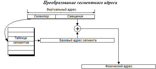 Рис. 5‑2 Селектор сегмента используется для доступа к соответствующей записи таблицы сегментов. Если данный сегмент присутствует в памяти, то его базовый адрес, прочитанный в таблице, складывается со смещением из виртуального адреса. Результат сложения представляет собой физический адрес, по которому и происходит обращение к памяти. Если сегмент отсутствует в памяти, то происходит прерывание. Обрабатывая его, система должна подгрузить сегмент с диска на свободное место в памяти, записать его базовый адрес в таблицу сегментов и затем повторить команду, вызвавшую прерывание. Но откуда возьмется свободное место в памяти? По всей вероятности, системе придется для этого убрать из памяти какой-то другой сегмент, принадлежащий либо к этому же, либо к иному процессу. Копия вытесняемого сегмента должна остаться в файле подкачки. Чтобы избежать лишней работы, в каждой записи таблицы хранится флаг, отмечающий, является ли сегмент в памяти «чистым» или «грязным», т.е. совпадает ли его содержимое с дисковой копией или же оно было изменено в памяти после последней загрузки с диска. «Грязный» сегмент должен быть сохранен на диске, для «чистого» сохранение не требуется. Если сегмент определен как доступный только для чтения, то он заведомо «чистый». Поскольку сегменты имеют различные размеры, то в ходе работы системы, сопровождающейся многократной загрузкой и выгрузкой сегментов, возникает эффект фрагментации памяти, описанный выше в п. 3.3 и в п. 5.3.3. Во всех случаях причиной фрагментации является многократное занятие и освобождение областей различного размера. Для борьбы с фрагментацией можно время от времени производить дефрагментацию, т.е. перемещение всех сегментов, находящихся в памяти, на новые места, без «дырок» в памяти между сегментами. При этом, однако, требуется, чтобы система откорректировала таблицы сегментов всех тех процессов, сегменты которых переместились в физической памяти. Кроме того, перемещение сегментов занимает ощутимое время, поэтому оно недопустимо для сегментов, содержащих, например, обработчики прерываний, которые должны срабатывать очень быстро. Чтобы избежать этих проблем, в некоторых системах сегменты могут находиться в одном из двух состояний: · фиксированный сегмент не должен перемещаться в памяти; · перемещаемый сегмент может перемещаться системой, однако программа не может обращаться к адресам в таком сегменте, поскольку его местоположение не определено. Чтобы работать с данными в перемещаемом сегменте, программа должна предварительно временно зафиксировать его вызовом специальной системной функции. При этом ОС определяет текущее местоположение сегмента и корректирует его базовый адрес в таблице сегментов процесса. Если же программа в течение некоторого времени не планирует обращаться к данному сегменту, то его следует расфиксировать, поскольку чем больше фиксированных сегментов в системе, тем менее эффективна будет дефрагментация. При переключении текущего процесса все, что должна сделать система в отношении памяти, заключается в замене таблицы сегментов. Для этого либо в специальный системный регистр записывается адрес таблицы сегментов текущего процесса, либо, если аппаратура допускает только одну таблицу сегментов, ее содержимое должно быть перезаписано так, чтобы соответствова
