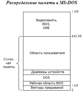 Рис. 5‑4 Нижнюю часть памяти занимают модули ОС: обработчики прерываний, резидентная чисть интерпретатора команд, драйверы устройств. Некоторые системные программы могут быть ради экономии загружены в верхний блок памяти (выше 640 Кб). Все, что остается в середине, может быть предоставлено процессу пользователя. Для пущей экономии памяти некоторые нерезидентные модули DOS могут занимать верхнюю часть области пользователя, но только до тех пор, пока не будут затерты пользовательской программой, которой потребуется вся имеющаяся память. Часть системной памяти и вся область пользователя разбита на прилегающие друг к другу блоки, размер которых кратен параграфу. Перед началом каждого блока памяти размещается блок управления памятью (MCB, MemoryControlBlock), который занимает один параграф и содержит следующие данные: · признак, определяющий, последний ли это блок памяти или за ним будут еще блоки (соответственно буква ‘Z’ или ‘M’, это, видимо, опять Марк Збиковский отметился); · адрес PSP программы, владеющей этим блоком (0 означает свободный блок); · размер блока в параграфах; · имя программы-владельца (до 8 символов); это поле избыточно (зная PSP программы, можно найти имя ее файла), оно было добавлено, вероятно, чтобы хоть как-то занять пустующие байты параграфа MCB. Когда система должна выделить блок памяти для собственных нужд или по запросу программы пользователя, она просматривает список блоков от начала, перемещаясь от одного MCB к следующему. Найдя свободный блок достаточного размера, система отмечает его как занятый соответствующим владельцем. Если выделяется не весь свободный блок, то после выделенного блока система записывает еще один MCB, описывающий свободный остаток блока. При освобождении блока система записывает 0 в поле владельца MCB. Если с одной или с двух сторон от освобождаемого блока лежат свободные блоки, то два или три свободных блока сливаются в один. При запуске программы система выделяет ей два блока памяти: сначала небольшой блок для переменных среды, затем самый большой среди оставшихся свободных блоков для самой программы (блок PSP, см. п. 4.4.3). Обычно этот блок занимает всю свободную память. Такое решение приемлемо, поскольку других претендентов на память нет. Почему блок среды выделяется раньше, чем блок PSP? При завершении программы система просматривает все блоки памяти и освобождает те из них, владельцем которых указана завершаемая программа. Исключением является случай завершения с установкой резидента (п. 4.4.4), при этом блок PSP не освобождается, но уменьшается до указанного размера. В дальнейшем этот блок остается занятым до перезагрузки системы. MS-DOS предоставляет в распоряжение пользователя функции, позволяющие выполнять основные действия с блоками памяти. · Выделение блока указанного размера. Если свободного блока достаточной величины не имеется, то система возвращает максимальный размер, который может быть выделен. · Освобождение ранее выделенного блока. · Изменение размера блока. Уменьшение блока возможно всегда, увеличение – только в том случае, если после данного блока расположен свободный блок достаточного размера. Одним из немногих случаев, когда эти функции оказываются полезны, является запуск порожденного процесса. Система должна иметь достаточно свободного места, чтобы разместить блок среды и блок P