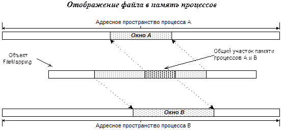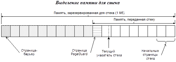 Рис. 5‑6 Стек по своему обыкновению растет в направлении убывания адресов, поэтому, начиная рост с самого старшего адреса, он постепенно заполняет одну страницу, а затем переходит ко второй, с меньшими адресами. Эта страница выделяется с атрибутом PAGE_GUARD, который, напомним, означает, что при первом обращении к странице генерируется прерывание, оповещающее об этом систему. Для Windows это сигнал, что пора передать стеку еще одну страницу памяти про запас, причем эта страница опять получает атрибут PAGE_GUARD, чтобы потом оповестить систему, что стек снова вырос. Так может продолжаться до тех пор, пока память не будет передана всем страницам региона стека, кроме самой младшей. Эта страница всегда остается зарезервированной и попытка записи на нее рассматривается как переполнение стека. Таким образом, младшая страница региона стека служит барьером, не позволяющим стеку выйти за начало региона. А почему необходим такой барьер? Для размещения динамических переменных удобно использовать объект «куча» (heap). Windows предоставляет каждому процессу собственную кучу, хэндл которой можно получить вызовом функции GetProcessHeap. После этого нити процесса могут запрашивать блоки памяти из кучи, вызывая функцию HeapAlloc. Параметры этой функции включают в себя хэндл кучи, размер запрашиваемого блока и некоторые флаги. По истечении надобности в выделенном блоке он может быть возвращен в кучу вызовом функции HeapFree. Небольшая проблема возникает в связи с тем, что к одной и той же куче могут обращаться разные нити одного процесса. Не исключено их одновременное обращение к функциям, работающим с кучей. Возникает проблема взаимного исключения, и Windows решает ее, используя встроенный мьютекс. Это называется сериализацией доступа к куче, т.е. последовательным выполнением запросов (от «serial» – последовательный). Для программы пользователя этот мьютекс не виден и можно не обращать на него внимания. Однако в том случае, если программист уверен, что нити не могут помешать друг другу, он может отключить сериализацию, указав соответствующий флаг или при открытии кучи, или при запросе блока. Это несколько повышает производительность. В некоторых случаях оказывается выгодно использовать не одну, а несколько куч для одного и того же процесса. Можно назвать, по крайней мере, две подобных ситуации. · Если с кучей работают две или более нитей процесса, то выделение отдельной кучи для каждой нити позволяет обойтись без сериализации, повысив таким образом производительность. · Если программа запрашивает из кучи блоки различного размера, то неизбежно такое знакомое нам явление, как фрагментация памяти. В данном случае она приведет к излишнему росту кучи и к замедлению работы. Иногда удается избежать фрагментации, выделив отдельную кучу для каждого используемого размера блоков. Например, из одной кучи будут запрашиваться блоки только размером 105 байт, а из другой – размером 72 байта. При выделении блоков одного размера фрагментации не возникает. Windows позволяет процессу создать любое количество дополнительных куч. Для этого нужно вызвать функцию HeapCreate, передав ей два числа: начальный размер физической памяти, передаваемой куче при создании, и максимальный размер кучи, задающий размер региона зарезервированной памяти для кучи. Если максимальный размер задан равным 0, то куча может ра