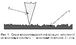 Сама технология записи на пластинки была довольно простой. При помощи специального аппарата в специальном мягком материале, виниле, делались засечки, ямки, полоски. И из этого получалась пластинка, которую можно было прослушать при помощи специального аппарата — патефона или проигрывателя. Приводился в действие механизм, вращающий пластинку, и ставилась игла на пластинку. Игла плавно плыла по канавкам, прорубленным в пластинке, издавая при этом различные звуки — в зависимости от глубины канавки, её ширины, наклона и.т.д., используя явление резонанса. А после труба, находившаяся около самой иголки, усиливала звук, “высекаемый” иголкой. (рис. 1) Почти такая же система и используется в современных (да и использовалась раньше тоже) устройствах считывания магнитной записи. Только поменялись сами составные части — вместо виниловых пластинок теперь используются ленты с напылённым на них сверху слоем магнитных частиц; а вместо иголки — специальное считывающее устройство. А трубка, усиливающая звук, исчезла совсем, и на её место пришли динамики, использующие уже более новую технологию воспроизведения и усиления звуковых колебаний. А в некоторых отраслях, в которых применяются магнитные носители (например, в компьютерах) пропала необходимость использования таких трубок.