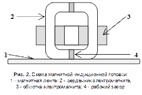 Магнитная лента состоит из полоски плотного вещества, на которую напыляется слой ферромагнетиков. Именно на этот слой “запоминается” информация. Процесс записи также похож на процесс записи на виниловые пластинки — при помощи магнитной индукционной вместо специального аппарата. На головку подаётся ток, который приводит в действие магнит. Запись звука на плёнку происходит благодаря действию электромагнита на плёнку. Магнитное поле магнита меняется в такт со звуковыми колебаниями, и благодаря этому маленькие магнитные частички (домены) начинают менять своё местоположение на поверхности плёнки в определённом порядке, в зависимости от воздействия на них магнитного поля, создаваемого электромагнитом. А при воспроизведении записи наблюдается процесс обратный записи: намагниченная лента возбуждает в магнитной головке электрические сигналы, которые после усиления поступают дальше в динамик. (рис. 2) Для данных нужно меньше места на плёнке, чем для звука. Просто вся информация, записываемая на магнитный носитель в компьютерах, записывается в двоичной системе — если при чтении с носителя головка “чувствует” нахождение под собой домена, то это означает, что значение данной частички данных равно “1”, если не “чувствует”, то значение — “0”. А дальше уже система компьютера преобразует данные, записанные в двоичной системе, в более понятную для человека систему. Сейчас в мире присутствует множество различных типов магнитных носителей: дискеты для компьютеров, аудио- и видеокассеты, бобинные ленты, жёсткие диски внутри компьютеров и.т.д. В приводе флоппи-диска (гибкого диска, или просто дискеты) имеются два двигателя: один обеспечивает стабильную скорость вращения вставленной в накопитель дискеты, а второй перемещает головки записи-чтения. Скорость вращения первого двигателя зависит от типа дискеты и составляет от 300 до 360 об/мин. Двигатель для перемещения головок в этих приводах всегда шаговый. С его помощью головки перемещаются по радиусу от края диска к его центру дискретными интервалами. В отличие от привода винчестера головки в данном устройстве не «парят» над поверхностью флоппи-диска, а касаются ее. Для подключения разных типов дисководов предназначены обычно комбинированные кабели с четырьмя разъемами, включенными попарно. Некоторые BIOS компьютеров позволяют программно изменять назначение физического адреса: «первый» (A:) и «второй» (B:) привод. В отличие от винчестеров, для флоппи-дисководов порядок накопителя (A: или B:) определяется именно положением устройства на кабеле. Для каждого из типоразмеров дискет (5,25 или 3,5 дюйма) существуют свои специальные приводы соответствующего форм-фактора. Дискеты каждого типоразмера (5,25 и 3,5 дюйма) бывают обычно двусторонними (Double Sided, DS), односторонние давно стали анахронизмом. Плотность записи может быть различной: одинарной (Single Density, SD), двойной (Double Density, DD) и высокой (High Density, HD). Поскольку об одинарной плотности уже мало кто вспоминает, такую классификацию обычно упрощают, говоря только о двусторонних дискетах двойной плотности (DS/DD, емкость 360 или 720 Кбайт) и двусторонних дискетах высокой плотности (DS/HD, емкость 1,2, 1,44 или 2,88 Мбайта). Плотность записи определяется величиной зазора между диском и магнитной головкой, а от стабильности зазора зависит качество записи (считывания). Для 
