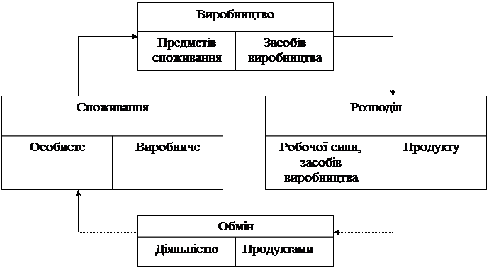 1.2. Виробничі відносини. 3 іншого боку, люди ніколи не працюютьвідокремлено один від одного. Так чи інакшевони пов'язані в своїй виробничій діяльності.Навіть Робінзон на своєму безлюдному острові користувався знаряддями праці (сокира, рушниця, лопата і т. ін.), перенесеними з затопленого корабля, тобто виготовленими іншими людьми. Як дотепно зазначив німецький письменник минулого століття Карл Берне, багато без чого людина може обійтися, але не без собі подібних. Тому створення матеріальних благ завжди є суспільним процесом. Отже, будь-яке виробництво має суспільний характер. А це означає, що в процесі виробництва люди вступають у відносини не лише з природою, але й між собою. І ці відносини отримали назву виробничих або економічних відносин. Виробничі відносини не слід розуміти лише як відносини, що виникають між людьми безпосередньо в процесі виробництва матеріальних благ або послуг. Під виробництвом, а точніше "суспільним виробництвом", економісти розуміють весь процес відтворення, який включає в себе чотири ланки (стадії): безпосередньо виробництво як процес створення матеріальних благ (послуг); розподіл , в результаті якого кожен учасник суспільного виробництва отримує свою частку у виробленому національному продукті (в натурі або в певній сумі грошей); обмін, в процесі якого отримана частка при розподілі (натуральна, грошова) обмінюється на необхідні конкретні засоби існування; споживання - тут вироблений продукт завершує свій рух, відбувається його кінцеве споживання, й тим самим дається поштовх до розпочинання нового виробничого циклу. У даному випадку виробництво розглянуто в його найголовнішій іпостасі - як основа життєдіяльності людей. Але ж виробництво, доставляючи засоби існування людям, обслуговує й само себе. Тому в кожній з названих стадій виконуються й чисто виробничі функції. Так, на стадії виробництва ми бачимо виробництво не лише предметів споживання, а й засобів виробництва. В процесі розподілу розподіляється, окрім продукту, робоча сила та засоби виробництва між різними сферами, галузями й підприємствами соціально-економічної системи. Виробнича функція стадії обігу проявляється в обміні діяльністю, а на стадії споживання паралельно з особистим діє виробниче споживання.