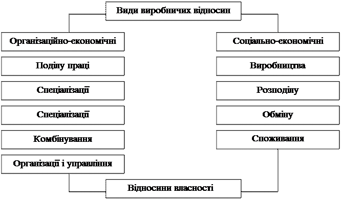 Підкреслюючи інертність організаційно-економічних відносин до відносин власності на засоби виробництва (тобто найпрогресивніша форма власності не забезпечить високої якості металу, якщо буде порушена технологія його виробництва), в той же час слід пам'ятати, що саме виробництво, а, отже, й організаційно-економічні відносини теж є похідними (як і соціально-економічні) від відносин власності. Історично будь-яке виробництво починається з привласнення кимось (общиною, державою, колективами людей або приватними особами) засобів виробництва. Правда, потім, на відміну від соціально-економічних відносин, вони функціонують як самостійні, що створює зовнішню видимість непричетності їх до власності на засоби виробництва. Це служить підставою багатьом західним економістам стверджувати (а зараз це повторюється і в Україні), що предметом політекономії (економічної теорії) повинні бути саме організаційно-економічні відносини, бо їх вивчення дає можливість, абстрагуючись від соціально-економічних відносин, вирішити завдання, як в умовах обмеженості ресурсів забезпечити економічне зростання й задовольнити безмежні потреби людей. Отже, структура виробничих відносин суспільства неоднорідна. Вона включає в себе соціально-економічні та організаційно-економічні відносини. Основою ж усіх виробничих відносин виступають відносини власності. В сукупності всі ці відносини складають систему виробничих відносин суспільства.