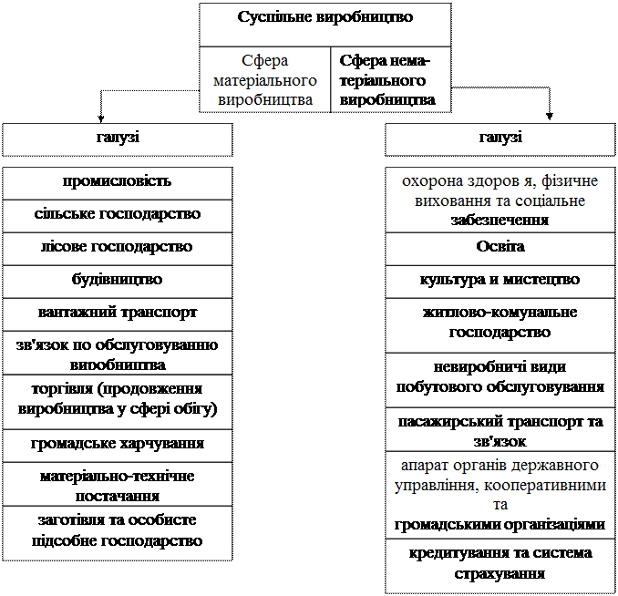 Кожна з названих сфер суспільного виробництва об'єднує багато найрізноманітніших галузей суспільно-економічної системи, що видно із схеми.
