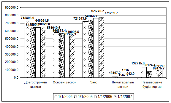 Якщо досліджувати динаміку необоротного капіталу ВАТ „ДніпроАЗОТ”, то основні засоби підприємства за три роки зменшились на 40914,1 тис. грн., довгострокові активи – на 77863,2 тис. грн., нематеріальні активи – на 12225,2 тис. грн., незавершене будівництво – на 36801,2 тис. грн. Динаміка показників представлена на рисунку 2.6.