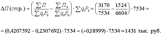 т.е. на 0,18999 тыс. руб. больше. Исходя из фактического объема реализации в ценах предыдущего периода, получаем следующее влияние изменения ассортимента на сумму прибыли: