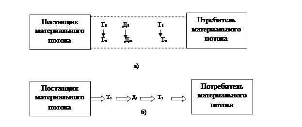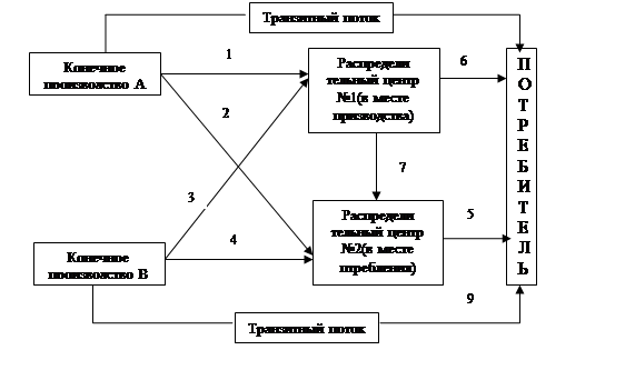 Рис. 5. Преобразование логистического канала в логистическую цепь: а) логистический канал, б) логистическая цепь Условные обозначения: T1 ... Tn – множество транспортно-экспедиционных фирм, оказывающих комплекс услуг по доставке товаров; Д1 ... Дm – множество дистрибьюторов. Принятие принципиального решения о реализации продукции через агентскую фирму и, таким образом, отказ от непосредственной работы с потребителем, является выбором канала распределения. Выбор же конкретной агентской фирмы, конкретного перевозчика, конкретного страховщика и так далее - это выбор логистической цепи. Логистическая цепь - это линейно упорядоченное множество участников логистического процесса, осуществляющих логистические операции по доведению внешнего .материального потока от одной. логистической системы до другой. На уровне макрологистики логистические каналы и логистические цепи являются связями между подсистемами макрологистических систем. В зависимости от вида макрологистической системы каналы распределения имеют различное строение. В логистических системах с прямыми связями каналы распределения не содержат каких-либо оптово-посреднических фирм. В гибких и эшелонированных системах такие посредники имеются. При выборе канала распределения происходит выбор формы товародвижения — транзитной или складской. При выборе логистической цепи — выбор конкретного дистрибьютора, перевозчика, страховщика, экспедитора, банкира и т. д. При этом могут использоваться различные методы экспертных оценок, методы исследования операций и другие. Возможность выбора логистического канала является существенным резервом повышения эффективности логистических процессов. Рассмотрим каналы распределения, по которым товары из конечного производства через систему распределительных центров попадают в конечное потребление (рис. 6.).