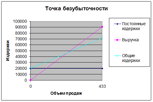 Планируется решение всех организационных и финансовых вопросов доверить одному лицу – управляющему. Для производства следует арендовать помещение. Существенным вопросом является обслуживание оборудования, плата за которое производится за каждый цикл работы оборудования (один цикл составляет 100 часов работы оборудования). Также необходимо учесть отчисления во внебюджетные фонды 26% от фонда оплаты труда работников. Необходимо рассчитать и построить график точки безубыточности. Оптовую цену предприятия с налогом на добавленную стоимость (НДС)18%, учитывая, что порог рентабельности равен 15%. Реализация продукции будет осуществляться через посредников за комиссионные, следовательно, розничная надбавка будет равна 10% с каждого проданного мяча. Определить объем чистой прибыли, если учесть что налог на прибыль 24%. Возможно ли нанять дополнительного рабочего для помощи в основном производстве. Решение: Nа = 1 / Tн * 100% = 1/6 * 100% = 16,7% (по линейному способу) Aмес = Sп * Nа / 12 * 100% = 130000 * 16,7% / 12 * 100% = 1809руб Объем продаж мячей в месяц = Объем продаж мячей в год / 12 = 5100 / 12 = 433мяча Расход на 1 мяч = Объем продаж мячей в месяц * расход на 1 мяч = 433 * 110 = 47630руб Фонд оплаты труда работников = З/пл.управляющего + 4 * З/пл.рабочего = 11000руб + 4 * 900руб = 14600руб. Отчисления во внебюджетные фонды = 26%от фонда оплаты труда = 0,26 * 14600руб = 3796руб. Общие затраты = Амес+ Расход на 1 мяч + Аренда + Фонд оплаты труда работников + Отчисления во внебюджетные фонды + Обслуживание оборудования в месяц. Производительность оборудования равна 4 мяча в час, цикл равен 100часам, тогда производительность оборудования мячей за цикл = 400, количество циклов в месяце = 433 / 400 = 1,08циклов. Обслуживание оборудования мячей = 1,08 * 1100 = 1188руб Общие затраты = 1809 + 47630 + 3000 + 14600 + 379 = 71935руб. Себестоимость 1 мяча = общие затраты / объем продаж мячей в мес. = 71935 / 433 = 166руб. Прибыль = 15% * себестоимость / 100% = 0,15 *166 = 24,9руб. Цена за 1 мяч = себестоимости + прибыль + цены упаковки + общие надбавки. Общие надбавки = Себестоимость * (НДС+РН) / 100% = 166 * (18%+10%) / 100% = 46,5руб, где НДС=18%, РН - розничная надбавка=10% с каждого мяча. Цена за 1 мяч = 166 + 24,9руб + 10руб + 46,5руб = 247,4руб. Выручка в месяц = Цена за 1 мяч * Объем продаж мячей = 247,4руб * 433 мяч. = 107124,2руб. Чистая выручка = Выручка в месяц – НДС НДС = Выручка в месяц * 18% / 118% = 107124,2 * 18% / 118% = 16341руб. Чистая выручка = 107124,2 – 16341 = 90783,2руб. Чистая прибыль = Чистая выручка – налог на прибыль (24%) = 90783руб – 90783руб * 0,24 = 68995,1руб. Постоянные затраты = Амес + Аренда + Обслуживание оборудования + З/пл. управляющего и часть отчислений во внебюджетные фонды = 1809 + 3000 + 1188 + 11000 + 0,26 * 11000 = 19857руб. Переменных затрат = Расходы на производство мячей + З/пл. работника в месяц + 26% заработной платы работника в месяц = 47630 + 900 * 4 + 0,26 * 3600 = 52166руб. Ккр = Зпост / (Ц – Зпер) * V = (19857 / (107124,2 – 52166)) * 433 = 156(мяч.) Критический объем производства в денежном выражении определяется по формуле: Ккр = Зпост / (1 – Зпер / Ц) = 19857 / (1 - 52166руб / 107124,2руб) = 38935,3руб На основе полученных данных построим график точки безубыточности. Точка пересечения кривой общих издержек с кривой выручки от реализации принято называть точкой безубыточности. Ниже этой точки располагается зона убыточности, при переходе этой точки наступает окупаемость всех издержек, и предприятие становится прибыльным.