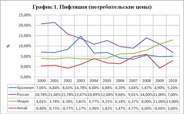 Государственное образовательное учреждение высшего профессионального образования РОССИЙСКИЙ УНИВЕРСИТЕТ ДРУЖБЫ НАРОДОВ КУРСОВАЯ РАБОТА ПЕРСПЕКТИВЫ СТРАН БРИК В ОБЛАСТИ БАНКОВСКОГО СОТРУДНИЧЕСТВАСтудент:Научный руководитель: Оценка: ___________________________ Дата: ______________________________ Подпись: __________________________ Москва 2010 Глава 1. Макроэкономические показатели экономик стран БРИК.. 5 1.1 Инфляция. 5 1.4 Структура импорта и эскорта. 9 1.5 Валовой внутренний продукт. 10 1.6Конкурентные преимущества стран. 15 1.7 Страны БРИК в период кризиса. 20 Глава 2. Банковские системы стран БРИК.. 24 2.1 Бразилия. 24 2.2 Россия. 25 2.3 Индия. 25 2.4 Китай. 26 2.5 Структура мировых валютных резервов. 28 Глава 3. Перспективы сотрудничества. 30 На сегодняшний день самыми перспективными в мире странами для бизнеса, по мнению многих аналитиков, являются Бразилия, Россия, Индия и Китай, или, как их часто называют, страны БРИК. Нужно отметить тенденцию последних лет: страны БРИК перестали восприниматься как источник дешевой рабочей силы и природных ресурсов, теперь руководители мировых компаний смотрят на страны БРИК как на крупнейший новый рынок сбыта. В этих странах развивается промышленность, услуги и, конечно, телекоммуникации. Причинами столь бурного роста можно назвать сразу несколько факторов: реформы, направленные на развитие рынка и усиление его привлекательности в глазах крупных инвесторов; большое количество сельского населения, то есть потенциальных потребителей, которые постепенно все больше и больше начинают интересоваться новой продукцией (pent-up rural demand); свободный рынок и почти полное отсутствие конкуренции среди больших компаний; дешевая инфраструктура. Совокупность этих факторов, а также быстрый рост и прогрессирующие объемы рынка привлекают большие корпорации и делают рынки стран БРИК притягательными для крупных инвестиций, а растущее количество заинтересованных потребителей представляют огромные возможности для развития бизнеса как в краткосрочной, так и в долгосрочной перспективе. Интересно, что последовательность первых букв от названий стран не случайна, дело в том, что на английском языке BRIC звучит также как и «brick», что переводится как «кирпич». Это символизирует, что в будущем, экономика именно этих четырех стран и будет обеспечивать рост всей мировой экономики. Как бы то ни было, вплоть до 2006-го года название БРИК было всего лишь термином, используемым аналитиками Голдмэн-Сакс. В сентябре 2006-го на шестьдесят первой сессии ООН, которая проводилась в Нью-Йорке все изменилось. Там состоялась встреча министров иностранных дел России, Китая, Бразилии и Индии. Затем главы этих четырех государств, для обсуждения дальнейшего сотрудничества собрались 9-го июля 2008-го года в Японии. В Бразилии чрезвычайно хорошо развито сельское хозяйство, а Россия богата полезными ископаемыми. В Китае очень дешевые трудовые ресурсы, в то время как в Индии дешевые интеллектуальные ресурсы. При всем при этом все четыре страны обладают высокой численностью населения, что также помогает обеспечивать экономический рост. Кроме того, на долю этих стран приходится двадцать шесть процентов территории Земли, сорок два процента населения планеты и четырнадцать с половиной процентов всего мирового ВВП. Первый саммит стран БРИК состоялся 16-го июня 2009-го года, в Екатеринбурге. В ходе саммита б