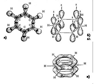 Рисунок 3 – Будова молекули бензену: а) s-скелет молекули; б) розташування негібридизованих pz-орбіталей перпендикулярно до площини σ-зв’язків; в) утворення колового спряження Колове спряження дає виграш в енергії 150,7 кДж/моль. Нагадаємо, що енергетичний виграш за рахунок утворення спряженої системи називається енергією спряження, або енергією делокалізації, і дорівнює енергії, яку необхідно витратити для руйнування ароматичної системи. Електронна будова і ароматичність бензену зумовлює його властивості, у тому числі високу термічну стійкість (він не розкладається навіть при нагріванні до 9000С), відсутність схильності до реакцій приєднання (незважаючи на велику ненасиченість), оскільки реакції приєднання супроводжуються порушенням ароматичності, а це енергетично невигідно. 2. КЛАСИФІКАЦІЯ. НОМЕНКЛАТУРА За кількістю бензенових кілець арени поділяються на дві групи. 1Моноядерні арени – це бензен та його гомологи, в яких один чи декілька атомів гідрогену заміщені на аліфатичні бокові ланцюги (насичені чи ненасичені). Назви моноядерних аренів утворюються від родоначальної структури – бензену (стара назва бензену, яка трапляється досить часто, – бензол) із зазначенням природи замісників та їх положення. Для багатьох гомологів бензену вживають тривіальні назви, які набули настільки широкого розповсюдження, що їх було введено у правила номенклатури IUPAC. Якщо бензенове кільце містить два радикали, то залежно від їх взаємного розташування використовуються додаткові префікси: орто- (1,2-положення), мета- (1,3-положення) і пара- (1,4-положення). Приклади моноядерних аренів: