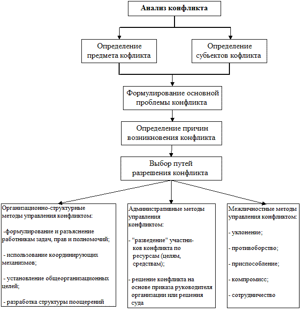 Стратегия разрешения конфликтов имеет целью прекращение противоборства сторон и поиск приемлемого решения проблем. Реализация этой стратегии предполагает действия руководителя по анализу реальных конфликтов и определению методов их разрешения (см. рис. 1.4). Различают организационно-структурные, административные и межличностные методы управления конфликтом. Организационно-структурные методы связаны с проведением изменений в структуре организации. К ним относятся: · четкое формулирование и разъяснение работникам их задач, прав, полномочий и ответственности. Это эффективный метод, предотвращающий возможные столкновения и помогающий «навести порядок», если конфликт уже получил свое развитие; · использование координирующих механизмов. Это установление иерархии полномочий, в сложных организациях — введение в структуру управления специализированных интеграционных служб, задачей которых служит увязка целей различных подразделений (межфункциональных групп, целевых групп, межотдельческих совещаний и др.). · установление общеорганизационных целей, формирование общих ценностей. Это объединяет работников организации, создает сплоченный коллектив и вероятность развития конфликтов значительно уменьшается. Повышению сплоченности коллектива и его «сработанности» способствует информированность всех сотрудников о стратегии, политике и перспективах развития организации и ее подразделений. · разработка структуры поощрений, при которой исключается столкновение интересов различных работников и подразделений. Административные методы управления конфликтом предполагают директивное вмешательство в его процесс. Например, для разъединения конфликтующих подразделений организации применяются административные меры, их разведение по ресурсам (целям, средствам). К этой группе методов относится решение конфликта на основе приказа руководителя или решения суда. К межличностным методам управления конфликтом относятся: уклонение, «уход от конфликта», подразумевающее, что человек старается быть нейтральным, находится в стороне от конфликта, чтобы не подвергаться стрессу. В этом случае конфликт продолжает развиваться, а у оппонентов усиливается чувство раздражения, поскольку их несогласие с положением вещей игнорируется. При таком подходе в конфликте проигрывают обе стороны. Тем не менее уклонение, «уход» может быть вполне разумным шагом, если конфликт не затрагивает прямых интересов «уходящего» сотрудника и своим подчеркнутым неучастием он не способствует усилению напряжения. Уход от конфликта на практике может проявляться в следующих формах: молчание, демонстративное удаление, затаенный гнев, депрессия, игнорирование обидчика, едкие замечания по «их» поводу за «их» спиной; переход на «чисто деловые отношения», полный отказ от дружеских или деловых отношений с провинившейся стороной;противоборство, конкуренция — это попытка заставить принять свою точку зрения любой ценой, не учитывать мнение других участников конфликта. В качестве примера этого стиля можно привести следующие приемы: требование безоговорочного послушания, применение физического насилия, попытка перехитрить своих оппонентов,, перекричать их, требование согласия другой стороны во имя сохранения хороших отношений и т. д. Лицо, использующее тако