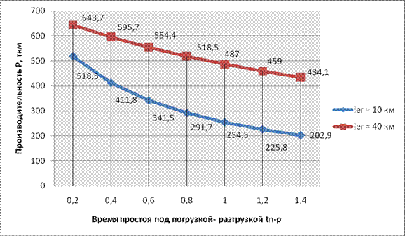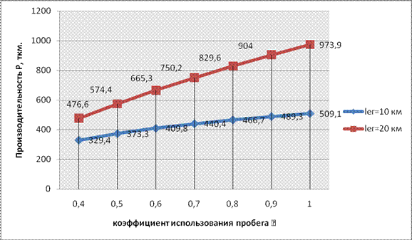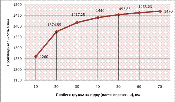 Влияние величины плеча перевозок на производительность подвижного состава. График изменения производительности подвижного состава в тоннах, в зависимости от изменения плеча перевозки представлен на рис.1