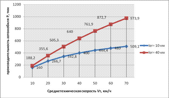 Рис.2 График изменения производительности подвижного состава в тонно- километрах, в зависимости от изменения плеча перевозки. ВЫВОД: С увеличением плеча перевозки производительность автомобиля в тоннах уменьшается, а в тонно-километрах- увеличивается. Влияние среднетехнической скорости на производительность подвижного состава Р, ткм. График изменения производительности подвижного состава в тонно- километрах, в зависимости от изменения среднетехнической скорости представлен на рис.3