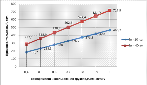 Рис.4 График изменения производительности подвижного состава в тонно- километрах, в зависимости от изменения коэффициента использования пробега. ВЫВОД: Производительность автомобиля в тонно-километрах находится в прямопропорциональной зависимости от коэффициента использования пробега. При увеличении плеча перевозки, изменение коэффициента использования пробега оказывает более сильное влияние на изменение производительности автомобиля. Влияние степени использования грузоподъемности на производительность подвижного состава. График изменения производительности подвижного состава в тонно- километрах, в зависимости от изменения коэффициента использования грузоподъемности представлен на рис.5