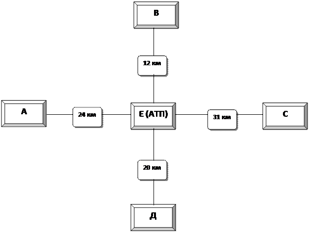 Расчет маршрутов Исходя из условия , данную задачу можно решить несколькими способами, но эффективность решения (коэффициент использования пробега) будет одинаковой для всех вариантов. Вариант №1. Движение организовывается по трем маятниковым маршрутам: Е-А; В-Е; С-Е. Вариант № 2. Движение организовывается по двум маршрутам: кольцевой Е-А-В-Е и маятниковый С-Е. Вариант №3. Движение организовывается по двум маршрутам: кольцевой Е-А-С-Е и маятниковый В-Е. Особенностью этих маршрутов во всех вариантах будет являться следующее: Коэффициент использования пробега равен 0,5. Произведем расчет маршрутов Е-А-С-Е и В-Е Схема маршрута №1 представлена на рис.2 Данный маршрут является кольцевым. На данном маршруте отсутствуют нулевые пробеги.