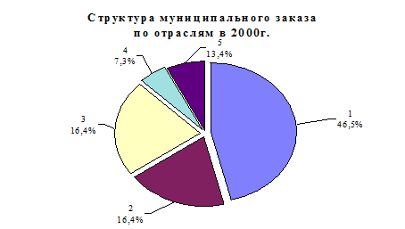 Из таблицы 2 видно, что общий объем финансирования с 1998 года увеличился на 50,7 млн. руб., то есть на 9,6%. До 1999 г. увеличивается оплата продукции, закупаемой путем проведения взаимозачетов на 75,3%. А уже с 2000г. вводится новая схема расчетов с исполнителями заказа - денежными средствами, в результате чего сокращается оплата путем взаимозачетов и увеличивается финансирование деньгами. А с апреля 2001г. все платежи, подлежащие к уплате в бюджет производятся только в денежной форме (Приложение 2). Структуру муниципального заказа по отраслям за 1998-2000гг.иллюстрируют следующие диаграммы: