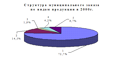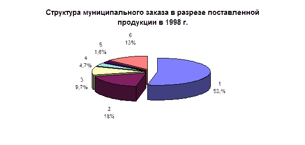 Как видно из представленных выше диаграмм поставки продукции в рамках муниципального заказа в наибольшем объеме производились по таким отраслевым направлениям: здравоохранение, образование, строительство, транспорт, энергетика. В 1998-1999 гг. обеспечение социально значимых объектов города тепло-и электроэнергией; приобретение и поставка транспортных средств, запчастей и горюче-смазочных материалов для муниципального транспорта; капитальный ремонт учреждений образования, здравоохранения, культуры и спорта, обеспечение их необходимым оборудованием, продуктами питания, медикаментами производились путем взаимозачетов (Приложение 3; 4 ) на сумму 381,9 млн. руб (1998г.) и в1999г. на сумму 406,1 млн.р. В то время как в 2000 г. социально значимые объекты в рамках муниципального заказа получили товары и услуги на сумму 1078,1 млн. руб. (по сравнению с 1998 годом больше на 696,2 млн. р.). Структуру муниципального заказа (1998-2000гг.) по видам продукции (товаров, работ и услуг), можно представить следующими диаграммами: