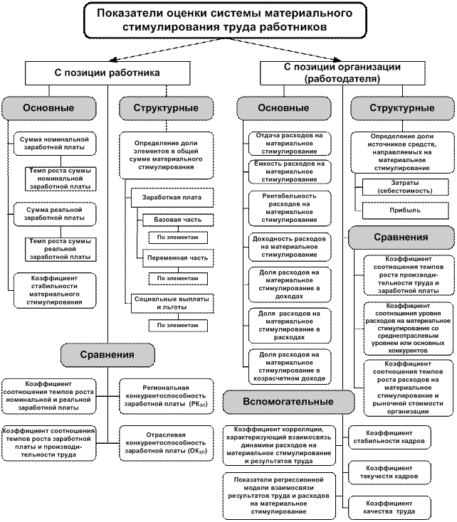 Рис.8. Система показателей оценки материального стимулирования с позиции работника и организации Эффективность системы стимулирования может оцениваться, с одной стороны, как экономическая отдача средств, затрачиваемых на стимулирование и внедрение самой системы, а с другой - как степень мотивирующего воздействия на трудовое поведение работника. 3.2. Организация и виды стимулирования трудовой активности персонала 3.2.1.Моральное стимулирование трудовой активности Моральное стимулирование является самой развитой и широко применяющейся подсистемой духовного стимулирования труда и основывается на специфических духовных ценностях человека. Разработанное в организации моральное стимулирование работников должно отвечать следующим требованиям: предусматривать поощрения за конкретные показатели, на которые работники оказывают непосредственное воздействие, и которое наиболее полно характеризует участие каждого работника в решении задач, стоящих перед ним; устанавливать меры поощрения за успехи в труде так, чтобы за более высокие достижения применять более значимые меры поощрения; обеспечивать уверенность в том, что при условии выполнения принятых повышенных обязательств участники будут поощрены в соответствии с достигнутыми результатами; усилить заинтересованность каждого работника в постоянном улучшении его производственных показателей; быть простым, доходчивым и понятным для работников; учитывать возрастающее общественно-политическую активность и профессионально-техническое мастерство, устойчивость высоких результатов в труде; недопущение обесценивания моральных стимулов. Одним из основных условий высокой эффективности морального стимулирования является обеспечение социальной справедливости, то есть точного учета и объективной оценки трудового вклада каждого работника.Особое значение имеет принцип гласности морального поощрения, то есть широкой информированности всего коллектива. Всесторонняя информация о результатах, достигнутых работниками и торжественная обстановка при вручении наград. Для этого необходимо каждого работника информировать не только устно, но и выдать брошюру с моральными стимулами за качественную работу. И на видном месте, в учреждении, вывесить плакат – таблицу с занесением фамилии и баллов каждого работника, и доску почета с отличившимися. При организации морального стимулирования важно обеспечить сочетание мер поощрения с усилением ответственности за результаты труда. Что повлечет за собой рост ответственности в коллективе.Мотивы трудовой деятельности, влияния моральных стимулов на работников во многом зависит от возраста, пола, квалификации, образования, стажа работы на предприятии, уровня сознательности. Необходимо учитывать это, осуществляя разработку условий поощрения.При внедрении системы нематериального стимулирования и выборе определенных методов влияния на эффективность работы сотрудников, необходимо на самых ранних этапах определить, как каждый сотрудник позиционирует себя по отношению к учреждению. По результатам диагностики могут быть определены следующие категории сотрудников: Сотрудник-индивидуалист - не отождествляет свои интересы с интересами учреждения, ориентирован на максимальную материальную мотивацию. Сотрудник-коллективист - с