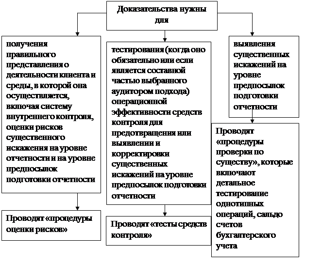 Под доказательством понимается факт, который может служить подтверждением или опровержением существования другого факта, или процесс получения сведений об определенном факте, которые позволяют сформировать мнение о достоверности бухгалтерской отчетности. При сборе, накоплении и анализе доказательств необходимо рассматривать: - их структуру; - требования, которым они должны отвечать; - виды (классификацию). Важно уметь выделять связи между полученными доказательствами, правильно выбирать пути их получения и организовывать процесс сбора. Аудиторские доказательства - это совокупность данных, используемых аудитором с целью формулирования обоснованных выводов, на которых базируется мнение аудитора. Доказательство состоит из тезиса, аргумента и демонстрации. Тезис - это суждение, истинность которого требуется доказать при помощи других суждений, называемых аргументами. Например, необходимо доказать, что финансовая отчетность содержит достоверную информацию (риск присутствия неверных данных не превышает определенного уровня). Аргументы делятся на пять следующих групп: 1. Положения об удостоверенных фактах представляют собой наиболее убедительные доводы для доказательства истинности тезиса. Основное предъявляемое к ним требование - бесспорность и безусловная точность. Например, аудитор, присутствуя при инвентаризации машинно-транспортного парка, имеет возможность лично убедиться в существовании машин, сверить их наличие с документами и сопоставить визуальную оценку износа с данными, отраженными в учете. При этом он может сделать вывод о бесспорности и точности показателей по данному пункту в финансовой отчетности. 2. Определения раскрывают с исчерпывающей полнотой содержание понятия, его смысловое значение. Например, если в учетной политике указано, что в организации используется ускоренная амортизация и в ведомости расчета амортизационных отчислений показан соответствующий результат, то данные числа можно отнести к этой категории аргументов, поскольку они позволяют подтвердить правильность начисления амортизации и, следовательно, значения прибыли и налогооблагаемых сумм. 3. Аксиомы - положения и принципы, которые принимаются за истинные без доказательств. Примером аксиомы может служить вывод, что если организация функционировала в течение какого-либо промежутка времени (продолжительность его в данном контексте значения не имеет), то у нее есть определенный капитал. 4. Постулаты - исходные допущения, принимаемые без доказательств. Постулаты доказывают, что при определенных условиях в качестве результата проверки можно получить объективную картину. 5. Ранее доказанные положения. Если отдельные положения были проверены ранее, то они не требуют дополнительного исследования; предполагается лишь рассмотрение дополнительных фактов, которые могут оказать влияние на достоверность. Демонстрацией называется способ выведения тезиса из аргумента. Демонстрация доказательства должна обеспечить, чтобы тезис логически вытекал из аргументов по правилам умозаключения, и логическая связь между ними была безупречно продемонстрирована. Выполняя процедуры, направленные на получение доказательств, аудитор не обязан рассматривать всю существующую информацию. Если аудитор получит аудиторские доказательства поср