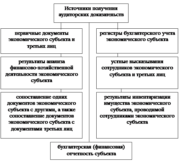 Рис. 6 - Источники получения аудиторских доказательств Качество доказательств зависит от их источников. Наиболее ценными аудиторскими доказательствами считаются доказательства, полученные аудитором непосредственно в результате исследования хозяйственных операций. Определение достаточности аудиторских доказательств зависит от следующих факторов: 1 степени аудиторского риска, т.е. вероятности принятия неверного решения аудиторской организацией; 2 наличия свидетельства от независимого источника (третьих лиц) как более достоверного, чем полученное непосредственно от сотрудников экономического субъекта; 3 получения аудиторского доказательства на основе данных системы внутреннего контроля, которое является тем более достоверным, чем лучше состояние системы внутреннего контроля; 4 получения информации в результате самостоятельного анализа или проверки аудиторской организации как более достоверной, чем сведения, полученные от других лиц; 5 получения аудиторских доказательств в форме документов и письменных показаний как более достоверных, чем показания в устной форме; 6 возможности сопоставления выводов, сделанных в результате использования доказательств, полученных из различных источников. Аудиторский риск уменьшается, если аудитор использует доказательства, полученные из различных источников и разные по форме представления. Если доказательства, полученные из одного источника, противоречат доказательствам, полученным из другого источника, аудитору необходимо использовать дополнительные аудиторские процедуры, чтобы разрешить возникшие противоречия и быть уверенным в достоверности собранных доказательств и обоснованности полученных выводов. Если аудиторской организации экономическим субъектом не представлены существующие документы в полном объеме и она не в состоянии собрать достаточные аудиторские доказательства по какому-либо счету и (или) операции, аудиторская организация обязана отразить это в отчете (письменной информации руководству экономического субъекта) и может рассмотреть вопрос о подготовке аудиторского заключения, отличного от безусловно положительного. 2.2 Методика получения доказательств Аудитор должен обладать полной, достоверной и надежной информацией, достаточной для выдачи обоснованных заключений. Источниками информации могут быть учетная система, подтверждающая документация, материальные активы, администрация и персонал предприятия, клиенты, поставщики и др. Информация, имеющаяся в распоряжении аудитора, должна позволить ему сделать обоснованное заключение о полноте учета активов и пассивов предприятия, правильности и достоверности учета доходов и расходов, определения прибыли. Аудитор должен сопоставлять выводы, сделанные в результате использования различных источников. Особое внимание при этом обращается на обнаружение и предупреждение подделок документов, что, в конечном счете, означает раскрытие и предотвращение многих нарушений и злоупотреблений. Анализ качества документов свидетельствует о том, что наиболее часто подделанные документы встречаются в торговле и общественном питании, в промышленности, сельском хозяйстве, органах государственного управления, строительстве, заготовительных организациях, финансовых органах, банках и т.д. Чаще всего подде
