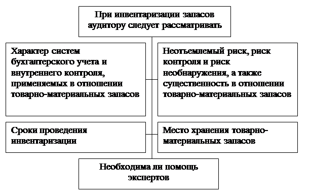 Рис. 8 - Основные виды аналитических процедур Важным приемом получения аудиторских свидетельств является присутствие аудитора при инвентаризации, в результате чего он выявляет наличие, принадлежность и правильность оценки ценностей. Для этого также используются регистры учета запасов, система бухгалтерского учета, результаты предыдущих инвентаризаций. При этом аудитор должен убедиться в доброкачественности проводимых инвентаризаций и правильности отражения результатов в бухгалтерском учете. Обычно руководство субъекта устанавливает процедуры, в соответствии с которыми, по крайней мере один раз в год, производится инвентаризация запасов, служащая основанием для подготовки финансовой отчетности или удостоверяющая надежность системы непрерывного учета запасов. В случае, если запасы существенны для финансовой отчетности, согласно МСА 501 «Аудиторское доказательство – дополнительные вопросы, касающиеся конкретных статей» аудитор должен получить достаточные соответствующие аудиторские доказательства относительно их наличия и состояния, присутствуя, если это практически осуществимо, при их инвентаризации. Такое присутствие позволит аудитору провести инспектирование запасов и наблюдение за выполнением установленных руководством субъекта процедур отражения и контролирования результатов подсчета, а также получить доказательства, подтверждающие надежность процедур, установленных руководством субъекта. Если в силу непредвиденных обстоятельств присутствие при инвентаризации запасов на запланированную дату не представляется возможным, аудитор должен выполнить процедуры подсчета или провести наблюдение за отдельными процедурами подсчета в какой-либо другой день. В ходе планирования присутствия при инвентаризации запасов или выполнения альтернативных процедур аудитор рассматривает данные, представленные на рис. 9.