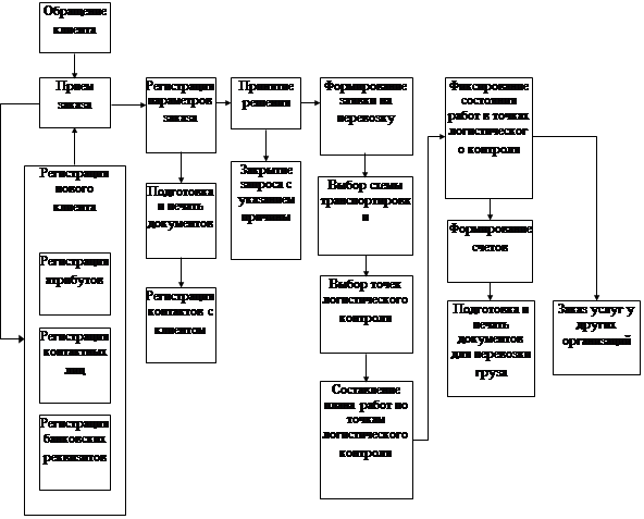 Рис. 13. Структурная схема работы программы interLogistics™ Заполнение справочников: 1) семейство услуг; 2) услуги; 3) структуры тарифов; 4) тарифы; 5) счета; 6) налоги; 7) заполнение тарифов для каждой услуги; 8) создание этапов транспортировки; 9) создание схемы транспортировки и запись ее в электронную базу данных. Информация в базе данных находится в специальных таблицах (справочниках). Программа предоставляет возможность полного доступа к редактированию информации, содержащейся в базе данных (добавление, изменение, удаление). Пользователи имеют возможность редактировать данные в справочниках в соответствии со своими правами. В программе предусмотрено несколько видов справочников [16]. Общие справочники: валюты, виды и типы транспорта, страны, области, регионы, населенные пункты, транспортные узлы, почтовые индексы, улицы и строения, упаковка, характер грузов, типы оборудования, языки, географические данные. Справочники компании: причины закрытия запроса, объекты, зоны (логистические, тарифные), средства пакетирования, способы выставления счетов, курсы валют, кадры (сотрудники), логистический контроль (точки логистического контроля, последовательность точек логистического контроля), типы документов, нормативные документы, справочник отчетов. Рабочие окна программы представлены на рисунке 14 – 16 [22]. Внедрение такого программного обеспечения позволит: 1) сократить время заказа за счет использования единого информационного пространства; 2) перейти на безбумажную технологию заказа АТИ; 3) постоянно контролировать процесс доставки АТИ, получать в реальном времени данные о местоположении груза и используемом виде транспорта; 4) сократить время на подготовку транспортных документов используя готовые формы из базы данных программы; 5) вести постоянный учет проданного АТИ; 6) создать базу данных по номенклатуре АТИ с указанием свойств груза способов его переработки и упаковки; 7) вести базу данных по поставщикам и потребителям АТИ с указанием их местоположения и наилучших маршрутов доставки заказов.