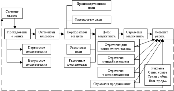 Рис.1.2 - Модель процесса стратегического планирования продвижения Рисунок 1.2 наглядно иллюстрирует модель стратегического планирования продвижения, построенную на основе анализа теории и практики планирования маркетинговых коммуникаций в России и за рубежом с учетом общих принципов маркетингового планирования. Хотя политика продвижения, или коммуникативная программа, относится скорее не к стратегическому (анализ потребностей, привлекательности и конкурентоспособности), а к тактическому маркетингу, большинство авторов признают необходимость принятия ряда стратегических решений при планировании коммуникаций. Исследование теории и практики планирования деятельности в сфере продвижения (как в целом, так и по отдельным инструментам), а также анализ общих принципов стратегического планирования позволяет нам выделить главные задачи, которые должны быть решены при моделировании методики разработки стратегии продвижения товара. Во-первых, необходимо выяснить, с чего начинать планирование в модели продвижения, а во-вторых, определить структуру стратегии продвижения (этот вопрос рассмотрен в последующих параграфах настоящего исследования). Изучение рынка логически предшествует определению цели коммуникаций. Именно рынок и его потребности определяют смысл коммуникаций вообще, требования к содержанию информации, месту и способу ее передачи. Только исследуя его, можно добиться успеха в продвижении товара, сэкономить немалые средства, которые могли бы быть потрачены впустую. В современных условиях, не зная, кто является потенциальным потребителем, как и где их выявить, каким образом вступить в контакт с каждым конкретным потребителем, предприятие неизбежно уступит "поле боя" конкурентам, которым удастся это сделать. Предприниматель может поставить перед собой цель получить определенный объем прибыли, добиться максимальной оборачиваемости средств или определенного расширения производства. Попытка достижения таких целей любым путем при определенных условиях может стоить неоправданных затрат и потери многих ресурсов. И если обратить внимание на рис.1.3, то можно увидеть, что планирование начинается именно с рассмотрения потребностей, диктуемых определенным сегментом рынка. И маркетинговые исследования играют здесь важнейшую роль.
