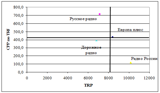 Рис.3.2 Диаграмма "эффект/эффективность" по данным табл.2.12 для радиостанций Анализируя данные рис.3.2, можно сделать вывод, что для размещения рекламы на радио радиостанция выбрана удачно. Условием для выбора и расчета стоимости рекламы на других радиостанция было количество выходов рекламных роликов по 30 секунд в год. В табл.3.12, 3.13, 3.14 представлены расчеты рекламных контактов в тысячах человек, стоимость за одну тысячу человек и стоимость за 1% для рекламы на "Радио России", рекламы в газетах ("Панорама TV", "Мой район", "Метро") и эффективности предыдущей рекламной кампании. Таблица 3.12 Показатели эффективности рекламы на "Дорожном радио"