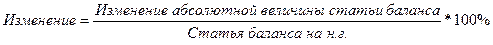 В графе 9 рассчитываются отношения изменений абсолютных величин статей баланса к величинам на начало года в процентах: