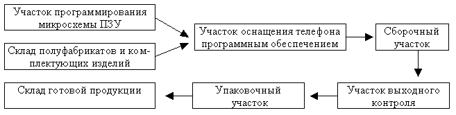 Рис. 4. Описание процесса производства по технологическим переходам Процесс производства телефона "Беседа-002" является экологически чистым и не требует специальных мероприятий по охране окружающей Среды. Оборудование Организация производства телефона "с бегущей строкой" "Беседа-002" требует наличия следующего оборудования: - компьютер Wearnes 436 DX-33 (1 ед.); - программатор СХ 324 (1 ед.); - стенд выходного контроля (1 ед.). Для организации процесса производства СП "ОККО" потребуется приобретение дополнительных средств производства (см.табл.2.). Таблица 2 Оборудование и оснастка
