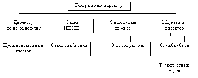 Рис. 5. Существующая структура управления Такая структура до последнего времени соответствовала целям и задачам деятельности компании, поскольку заказы на производство продукции поступает в компанию напрямую от крупных покупателей. Таким образом, СП работало на заказ, точнее на одного крупного заказчика. Такая ситуация делала нецелесообразным содержание в штате коммерческого подразделения (службы сбыта или маркетинга), которое бы занималось поиском клиентов. Эту работу осуществлял сам генеральный директор, имеющий широкие связи и контракты с потенциальными заказчиками. Небольшие мощности предприятия, также делали не возможным резкое увеличение объемов производства для реализации продукции широкому кругу потребителей. При условии начала реализации проекта, предлагаемого в бизнес-плане - производство телефонных аппаратов для слепых и слабослышащих, существующая структура должна быть коренным образом изменена и адаптирована к рыночным условиям. Реструктуризация системы управления компанией - одно из основных условий, приводящих компании либо к краху, либо к успеху на рынке. Компания, действующая в условиях рыночных отношений, может добиться своей конкурентоспособности только посредством адаптации своей структуры к условиям рынка. Для успешного проведения этого процесса в большинстве случаев необходимо привлечение специалистов в области менеджмента и маркетинга. Адаптация к рыночным условиям, на наш взгляд, выражается, прежде всего, к появлению в структуре компании должности маркетинг-директора, функционирующего на правах заместителя генерального директора. Маркетинг-директор должен стать ключевой фигурой в компании, взяв на себя всю полноту ответственности за реализацию производимой фирмой продукции. Необходимость включения в структуру управления СП "ОККО" должности маркетинг-директора диктуется несколькими основными причинами: 1. Выход на массовый рынок - большое количество единичных покупателей, желающих приобрести товар; 2. Увеличение объемов производства продукции. 3. Расширение географических границ рынка. Эти причины предопределяют необходимость введения в практику деятельности компании следующих мероприятий: построение торгово-распределительной сети и системы товародвижения, сбор и анализ рыночной информации, планирование ассортимента продукции, поиск новых возможных направлений диверсификации деятельности фирмы, организация мероприятий по рекламе, паблик рилейшинз, стимулирование сбыта и т.п. Эти функции являются сферой деятельности маркетинга, а значит маркетологов. Для СП "ОККО" предлагается структура управления, предложенная на рис.6.