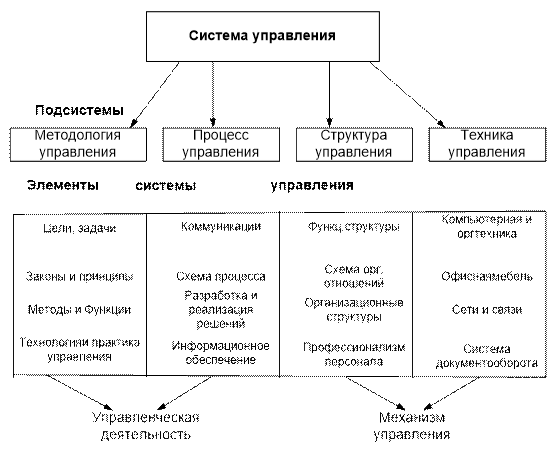 Рис.2.1. Место системы управления в социальной системе и, по нашему мнению, отражают лишь часть современной системы управления, которая должна включать элементы развития, в том числе методологическую (управленческую) поддержку при разработке и реализации решений. Анализ существующих подходов к СУ позволил сформировать для нее общее определение: Система управления представляет совокупность всех элементов, подсистем и коммуникации между ними, а также процессов, обеспечивающих заданное функционирование организации. СУ — это сложное образование процессов и явлений, совершенствование которого может идти с различной степенью детализации. Реальная экономическая, организационная и психологическая эффективность такого совершенствования зависит от методики и времени проведения, интуиции и профессиональной подготовки руководителя или специалиста. Можно предложить расширенный набор элементов, входящих в СУ и состоящий из четырех подсистем: методологии, структуры, процесса и техники управления. Рис. 2.2. Методология управления включает: цели, законы и принципы, функции, методы, технологии управления и практику управленческой деятельности. Процесс управления представляет: систему коммуникаций, разработку и реализацию управленческих решений, информационное обеспечение.