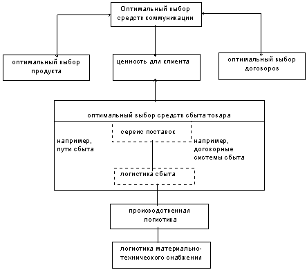 Рисунок 2.2 - Место системы маркетинговой логистики Место системы маркетинговой логистики может быть иллюстрировано графически в виде графа], где процесс производства, складирования и перевалки через узлы, процессы транспортировки показаны стрелками. Такая сетевая модель может выступить как вспомогательное средство при планировании маркетинговой логистики. Задачами здесь могут быть разработка, оценка, и выбор альтернатив для структурной и процессуальной организации потока грузов и информации в сфере сбыта товаров. В качестве критериев оценки выступают затраты на логистику, а также сервис поставок. Следует учитывать также подвижность (способность к приспособлению) систем маркетинговой логистики ввиду роста изменчивости, непостоянства, неуверенности и скорости изменений поведения потребителей, что особенно важно в сфере потребительских товаров. Наряду с внутренним согласованием (специфического для сферы объекта) частичного планирования маркетинговой логистики из ее функции взаимодействия вытекают дальнейшие требования к интеграции. Следует различать четыре уровня интеграции. Интеграция с другими сферами оптимального выбора маркетинговых инструментов (внутренняя функция интеграции) является важной, т. к. в восприятии клиентов именно комбинированное использование этих инструментов составляет ценность предложения услуг (фокусировка эффективности). Между сервисом поставок как выход маркетинговой логистики и другими инструментами маркетинга существуют как замещающие, так и дополнительные связи. Особенно тесная взаимосвязь существует между маркетинговой логистикой и решением, побуждающим к сбыту, которое весьма существенно устанавливает количество приемных пунктов (например, мало оптовиков или много розничных торговцев), которые подлежат обслуживанию со стороны системы логистики. Тесная взаимосвязь между маркетинговой логистикой и каналом сбыта вытекает также и из того, что логистические системы учреждений, отвечающих за сбыт товаров изготовителя, должны соответствовать друг другу. При этом, правда, необходимо учитывать, что физический поток грузов, поток собственности (поток прав на грузы), поток платежей, поток информации и поток содействия сбыту абсолютно не должны постоянно проходить через одни и те же учреждения. Более того, часто вполне разумно отделить друг от друга различные типы потоков. Использование коммуникативно-политических инструментов координируется по месту и времени с мероприятиями маркетинговой логистики. Прежде всего рекламные кампании должны быть тщательно обеспечены при помощи логистических мероприятий. В принципе, хорошая реклама может иметь негативные последствия в результате недостаточной логистической поддержки. Внутри фирмы недостаточная подготовка к обусловленному рекламой повышению спроса приводит к срочно необходимым логистическим мерам приспособления с чрезмерно высокими затратами. В рамках политики продукта во многих отраслях наблюдается тенденция расширения программы продукта при помощи новых продуктов или при помощи дифференцирования продукта, чтобы быть в состоянии удовлетворить индивидуальные пожелания клиентов. Это является следствием стратегии дифференциации. [13] Стратегия маркетинговой логистики является элементом стратегии маркетинга 