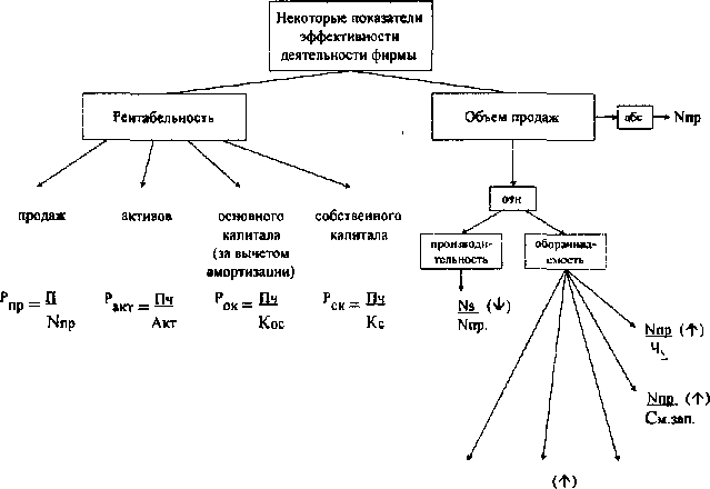 Рентабельность Рентабельность Рентабельность Рентабельность Nnp (t) Nnp Акт Кос Nnp W Коб. к Рисунок 2 "Некоторые показатели эффективности деятельности фирмы" Показатель Кп является интегральной численной характеристикой конкурентоспособности продуцента. Если Кп<1, то рассматриваемая фирма уступает другой компании по конкурентоспособности, если Кп>1, то превосходит; при равной конкурентоспособности Кп=1. Среди экономических показателей, которые могут быть использованы при сопоставлении фирм наибольшее распространение получили следующие : Рентабельность продаж определяется по формуле: где РПр — рентабельность продаж; П — прибыль за отчетный период (год); Nпр — объем продаж за отчетный период (год) (реализованная продукция). В числители может быть взята как валовая прибыль, так и чистая. Если полученное отношение будет равно, например, 10%, то это означает, что на каждую условную денежную единицу реализованной продукции приходится 10% прибыли. Рост отношения может означать либо повышение цен (при неизменных издержках производства), либо снижение последних при сохранении прежних цен. Уменьшение может быть вызвано как снижением цен, которое не сопровождается сокращением издержек, так и повышением себестоимости, не сопровождаемым повышением цен. В любом случае уменьшение этого показателя означает падение спроса на продукцию фирм и, как следствие, снижение рентабельности ее операций. Рентабельность активов определяется по формуле: где Ракт - рентабельность активов; Пч — прибыль (чистая) за отчетный период; Акт — активы (итого баланса) на конец отчетного периода. Показатель отражает эффективность" использования всего имущества фирмы (оборотного и основного напитала) или всего инвестированного капитала. Низкий уровень по сравнению с аналогичным показателем у других фирм свидетельствует о перевложении капитала в активы, или о низком спросе на продукцию фирмы. Рентабельность основного капитала рассчитывается по формуле: где рок — рентабельность основного капитала, Пч — прибыль (чистая) за отчетный период, Кос — основной капитал, за вычетом амортизации на конец отчетного периода Чем выше значение этого показателя, тем эффективнее используются основные средства фирмы. Его рост при снижении рентабельности активов в целом будет означать чрезмерное увеличение оборотных средств (либо происходит затоваривание готовой продукцией, либо образовались излишние материально-производственные запасы, либо возросла дебиторская задолженность или наличность). Выяснение причин такого положения требует дополнительного анализа динамики структуры оборотных активов. Рентабельность собственного капитала. Как показатель широко используется в зарубежных экономических публикациях. Он отражает эффективность использования капитала, инвестированного в фирму за счет собственных источников финансирования. Его изменение обычно оказывает влияние на уровень котировки акций на фондовых биржах. где Рск — рентабельность собственного напитала; пч — прибыль (чистая) за отчетный период); кс - собственный капитал (балансовая стоимость) на конец отчетного периода В Великобритании и странах, перенявших английскую правовую систему, вместо данного показателя чаще используется рентабельность с собственного и долгосрочного заемного капитала. В основу е