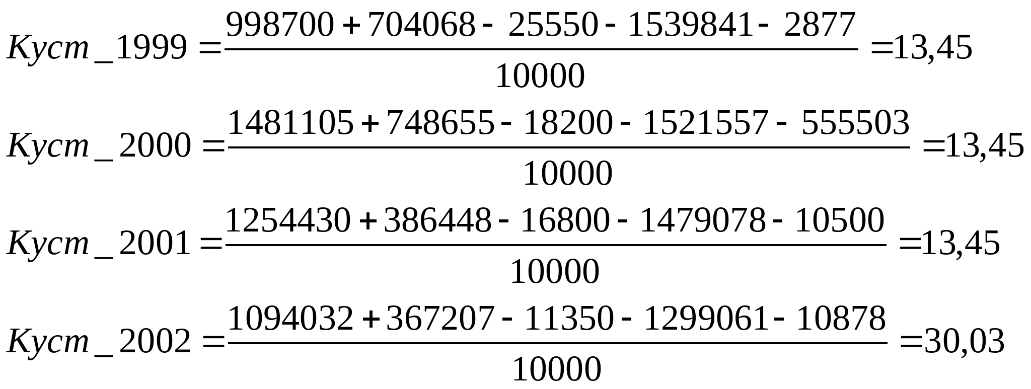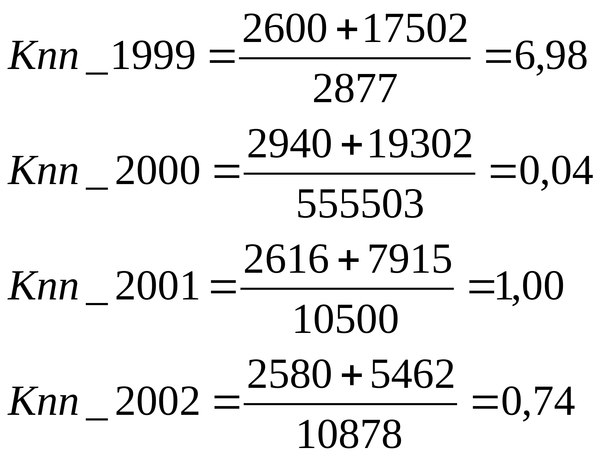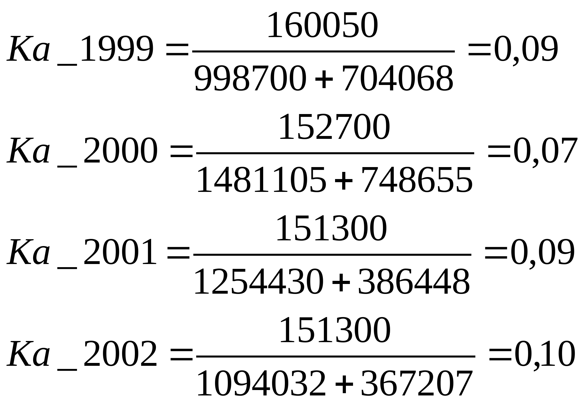 В рассматриваемом периоде исключительно положительное значение данного показателя было на конец 1999 года. Тогда предприятие еще не успело ощутить на себе все негативные последствия кризиса да и в целом за 1999 год ситуация складывалась удачно. Все негативные последствия кризиса в полной мере проявились в течение 2000 и начале 2001 года, что и сказалось на ухудшении практически всех показателей ФСП. На протяжении 2001 и 2002 года такой разницы в значении этого показателя не наблюдается и в целом оно находится в нормативных пределах. 2. Промежуточный коэффициент покрытия (260+250+240)/(690) Для вычисления коэффициента критической ликвидности (Кпп), или промежуточного коэффициента покрытия, в состав ликвидных средств в числитель относительного показателя включается дебиторская задолженность и прочие активы. Он отражает прогнозируемые платежные возможности предприятия при условии своевременного проведения расчетов с дебиторами. Оценка нижней границы данного показателя выглядит так: Кпп >= 1. Этот коэффициент характеризует ожидаемую платежеспособность предприятия на период, равный средней продолжительности одного оборота дебиторской задолженности. Денежные ср-ва + Краткоср. фин. ср-ва. + Дебиторск. задолж. Кп.п. = Краткосрочные обязательства Практически аналогичная предыдущей ситуация. Разница составляет только величину денежных средств, которые предприятие не держит в кассе и на расчетных счетах в большом количестве. Средства аккумулируются только перед предстоящими крупными выплатами, такими как выплата заработной платы, налогов и отчислений, закупка сырья. 3. Коэффициент обеспеченности запасами краткосрочных обязательств (210)/ (690) Показывает какую долю краткосрочных обязательств предприятие сможет обеспечить за счет своих оборотных активов средней ликвидности. Оптимальное значение данного коэффициента => 0,8. Запасы и затраты Ко.п. = Краткосрочные обязательства Большой разброс значений показателя за 1999 и 2000 годы объясняется тем, что предприятие допустило большую задолженность поставщикам. В течение практически всего 1999 года запасы закупались на месяц вперед и лежали на складе. Оборотных средств предприятию хватало и краткосрочных ссуд и займов не брали. В 2000 году ситуация с запасами сырья ухудшилась. Базирующееся на качестве своей продукции предприятие не могло позволить себе качественное сырье по ценам того уровня и приобретать его могло только «по случаю». То есть появляется недорогое (в смысле по приемлемым ценам) отечественное сырье, которое надо срочно закупать, предприятие берет заем и выкупает сырье на месяц. В конечном итоге проценты по займу были ниже, чем потеря или престижа фирмы от потери качества продукции или потери денег от закупки дорогого сырья. Ситуация, когда оборотный капитал хотя бы на половину обеспечивается заемными средствами во всем мире считается нормальной и желательной. В нашей стране стоимость пользования заемными средствами еще сильно велика, но предприятие ООО "Ива-Контакт" нашло выход в виде недорогих займов у физических лиц. Небольшие проценты по таким займам обусловлены «особыми» отношениями директора фирмы с заемщиками. В 2001-2002 годах положение стабилизировалось, о чем свидетельствуют примерно одинаковые значения данного показателя (35,18-32,51) . Таблица 12 «Свод показателей платежеспособнос