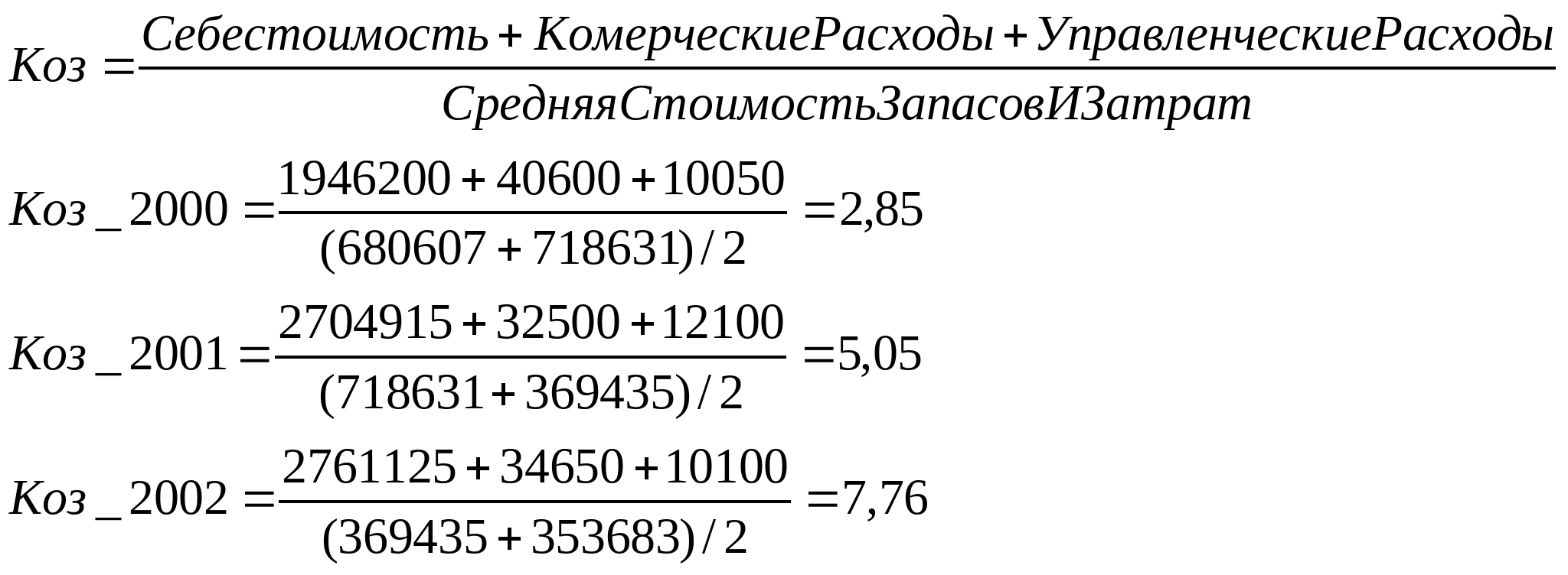 На протяжении трех лет с 2000 по 2002 год значение данного показателя улучшалось в среднем на 0,4 в год, что характеризует все более активное участие активов предприятия в формировании финансового результата (увеличении выручки) главным образом за счет того что доля оборотных активов в 2002 году по отношению к 2000 снизилась более чем в два раза, а выручка (за счет повышения цен на продукцию) продолжала расти. Это с положительной стороны характеризует деятельность фирмы, налицо выгода от увеличения оборачиваемости активов. 2. Коэффициент оборачиваемости запасов (020+030+040)Ф2/(210) Так же показывает оборачиваемость активов предприятия, но по отношению к собственным расходам. Оптимальный показатель выше 4,0 [19].