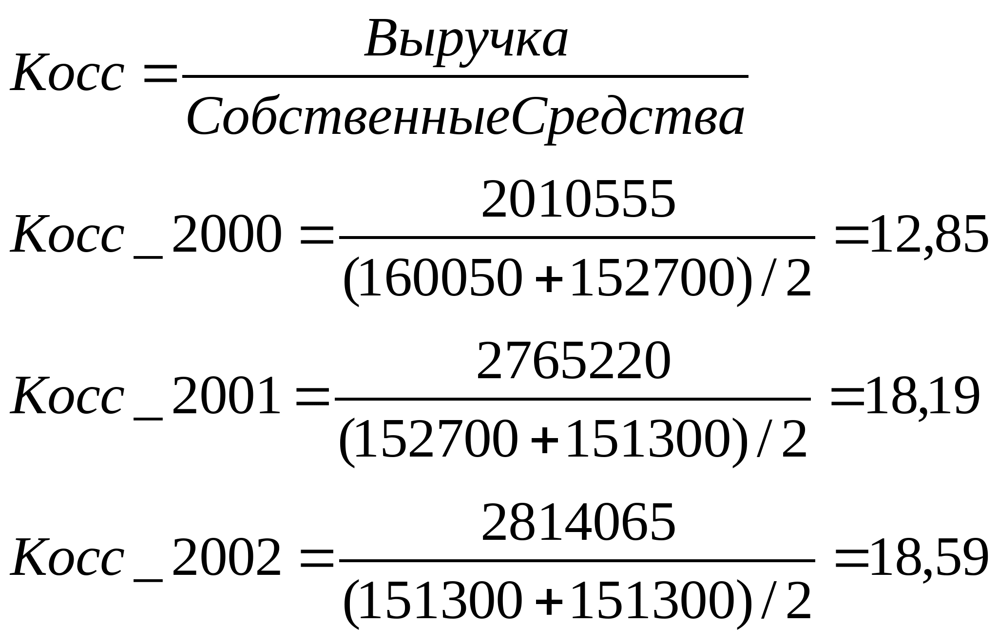 За период с 2000 по 2002 год наблюдается повышение оборачиваемости в среднем в два раза. В 2000 году значение данного показателя находилось на неудовлетворительном уровне (2,85 относительно 4). Себестоимость производства, хотя и была низкой по отношению к 2001 году, стоимость запасов фирмы все еще находилась на высоком уровне. К концу 2001 года и на протяжении 2002 года стоимость запасов снизилась более чем в два раза (с 718 тысяч до 353 тысяч), что не могло не сказаться на заметном улучшении данного показателя (до 7,76 к концу 2001 года). Снижение запасов обусловлено следующими факторами. Если в 2000 году обеспечение предприятия качественным сырьем производилось исключительно через закупку больших партий в Москве, то в последующие годы Ивановские поставщики могли сами обеспечить качество сырья при приемлемых ценах. В 2001 – 2002 годах предприятие уже не могло себе позволить затаривание склада сырья практически на месяц вперед, а покупало основное сырье в расчете на два – три дня работы. 3. Коэффициент оборачиваемости собственных средств (010Ф2/490) Характеризует участие собственных средств предприятия в формировании выручки от реализации продукции. Оптимальное значение показателя более 1,0 [19]. Завышенное значение данного показателя объясняется малой долей собственных средств в структуре баланса. Начиная с самого рождения предприятие приобретало основные фонды, а в 2000-2001 годах и по большей части работало на средствах заемных. Так к концу 2000 года доля собственных средств в активах предприятия составила 152700/(1481105+748655)=6%, к концу 2001 составила 151300/(1254430+386448)=9%, а к концу 2002 года 151300/(1093000+367207)=10%. Увеличение данного показателя за анализируемый период характеризуется повышением выручки, главным образом за счет повышения цен на продукцию при практически неизменной величиной собственного капитала. Таблица 13 «Свод показателей деловой активности»