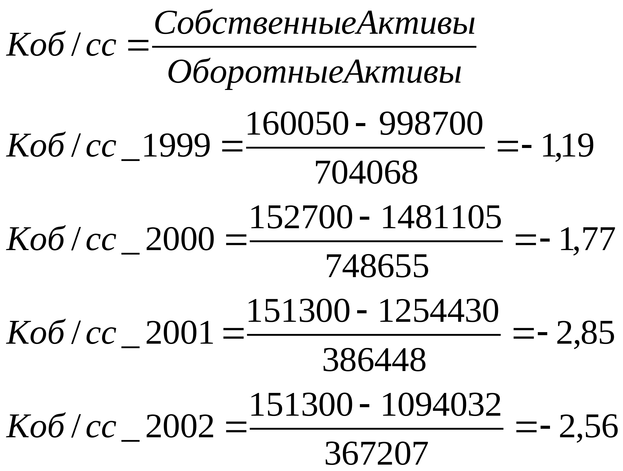 Как видно из Таблица 13 показатели деловой активности характеризуют высокую жизнеспособность предприятия, причем его деловые характеристики из года в год улучшаются. О чем свидетельствуют различия в темпах роста выручки и величины ресурсов, обеспечивающих эту выручку. Показатели оценки структуры баланса 1. Коэффициент текущей ликвидности (290)/(690-640-650-660) Характеризует участие обязательств по срокам менее 12 месяцев в оборотных активах предприятия. Оптимальное значение показателя выше 1,8. Коэффициент показывает, какую часть краткосрочных обязательств предприятие может покрыть оборотными активами. Значения показателя за 1999, 2001 и 2002 годы находятся в зоне благополучия, что объясняется малой долей краткосрочных обязательств в структуре баланса предприятия. В 2000 году ситуация иная. В течение этого года предприятие вынуждено было брать краткосрочные кредиты, как у поставщиков, так и у частных лиц на приобретение сырья и к концу года практически все оборотные активы состояли из заемных средств. 2. Коэффициент обеспеченности собственными средствами (490-190)/(290) Этот коэффициент показывает, какая часть собственных средств находится в мобильной форме, которая позволяет свободно маневрировать этими средствами. Обеспечение собственных текущих активов собственным капиталом является гарантией устойчивости финансового состояния. Оптимальное значение этого показателя равно 0,15, а критерий коэффициента обеспеченности запасов на уровне не ниже 0,15. Значения данного показателя только лишний раз подтверждают вывод о том, что предприятие по большей части пополняет оборотные средства за счет внешних источников. Уменьшение значения показателя в течение 1999-2001 годов в среднем на 0,56 главным образом из-за уменьшения доли собственных средств и увеличении доли внеоборотных активов за счет покупки основных фондов. И все это на уровне уменьшения суммы оборотных активов. К концу 2002 года, по сравнению с предыдущим 2001 ситуация несколько улучшилась за счет уменьшения стоимости внеоборотных активов за счет выбытия ненужных и начисления амортизации. 3. Коэффициент соотношения чистых активов и уставного капитала (190+290+640+650-460-590-690)/(410) Характеризует обеспеченность чистых активов предприятия средствами уставного фонда. Оптимальное значение показателя более 2,0. Большое количество активов, по сравнению с величиной уставного фонды нетрудно объяснить. На большинстве ТОО, ООО сумма уставного фонда минимальна. То есть 10 тысяч рублей. Это тот минимум, который требуется для регистрации нового предприятия. Люди организующие фирму, стараются не показывать большой уставный фонд, ведь по закону учредители несут ответственность в приделах уставного фонда. Лучше внести деньги в другом виде. В данном случае на протяжении трех лет (1998-2000) величина коэффициента оставалась постоянной, а к концу 2002 года возросла до 30,3 за счет увеличения чистых активов. Целесообразно рассматривать этот показатель исключительно в контексте изменения величины чистых активов без связи с УФ. Таблица 14 «Свод показателей оценки структуры баланса»