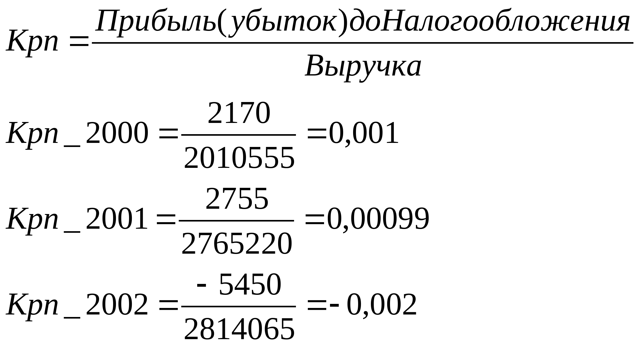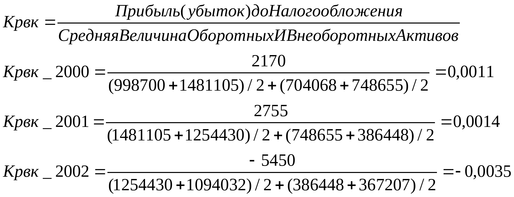 Как видно из Таблица 14 значения коэффициента текущей ликвидности находятся в пределах выше зоны благополучия, тогда как значения коэффициента обеспеченности собственными средствами ниже самой негативной оценки. Это говорит о том, что на предприятии большая часть оборотных активов – заемные средства. Завышенное (в лучшую сторону) значение коэффициента чистых активов и уставного капитала говорит о невысокой доле последнего и эго низким участием в образовании активов предприятия. В целом обстановка по показателям оценки структуры баланса положительная. Показатели рентабельности Характеризуют отношение затрат (вложений) и доходов предприятия. Основная группа показателей, ведь получение прибыли есть главная цель любого коммерческого предприятия. 1. Коэффициент рентабельности использования всего капитала (140Ф2/190+290) Оценивает эффективность использования активов предприятия в формировании финансового результата (прибыли) В течении двух лет (2000-2001) значение показателя практически равно нулю (чуть более 0,1%), а в 2002 году получен убыток, который составил –0,3%. 2. Коэффициент использования собственных средств (140Ф2/490) 3. Коэффициент рентабельности продаж (140Ф2/010Ф2) 4. Коэффициент рентабельности по текущим затратам (140Ф2)/(020+030+040)Ф2. Таблица 15 «Свод показателей рентабельности»