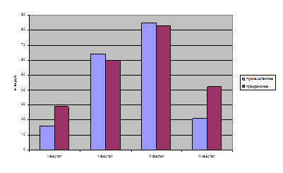 На рис. 2.1 видна сезонность в спросе на строительные работы. Основной пик работ приходится на период с марта по октябрь. На рис. 2.2 и рис. 2.3 представлено соотношение в структуре работ ООО «Ремстройбыт» промышленного и гражданского строительства в 2002-2003 годах. Рис 2.2 Валовая прибыль ООО «Ремстройбыт» по генеральным подрядам в промышленном и гражданском строительстве в 2002 году
